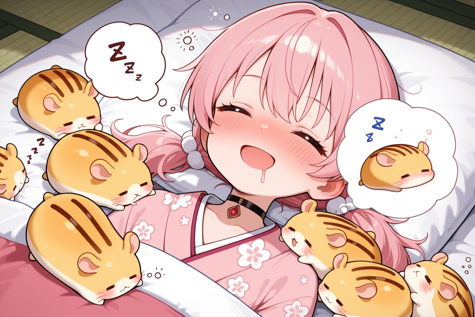 1 little girl, solo, diagonal angle, upper body, masterpiece, best quality, amazing quality, very aesthetic, pink hair, twintails, =_=, open mouth, drunk, blush, smile, cheerful, saliva, sleeping, squeans, spoken squeans, choker, pink kimono, shared thought bubble, thought bubble, spoken zzz, zzz, too many hamsters, futon, pillow,