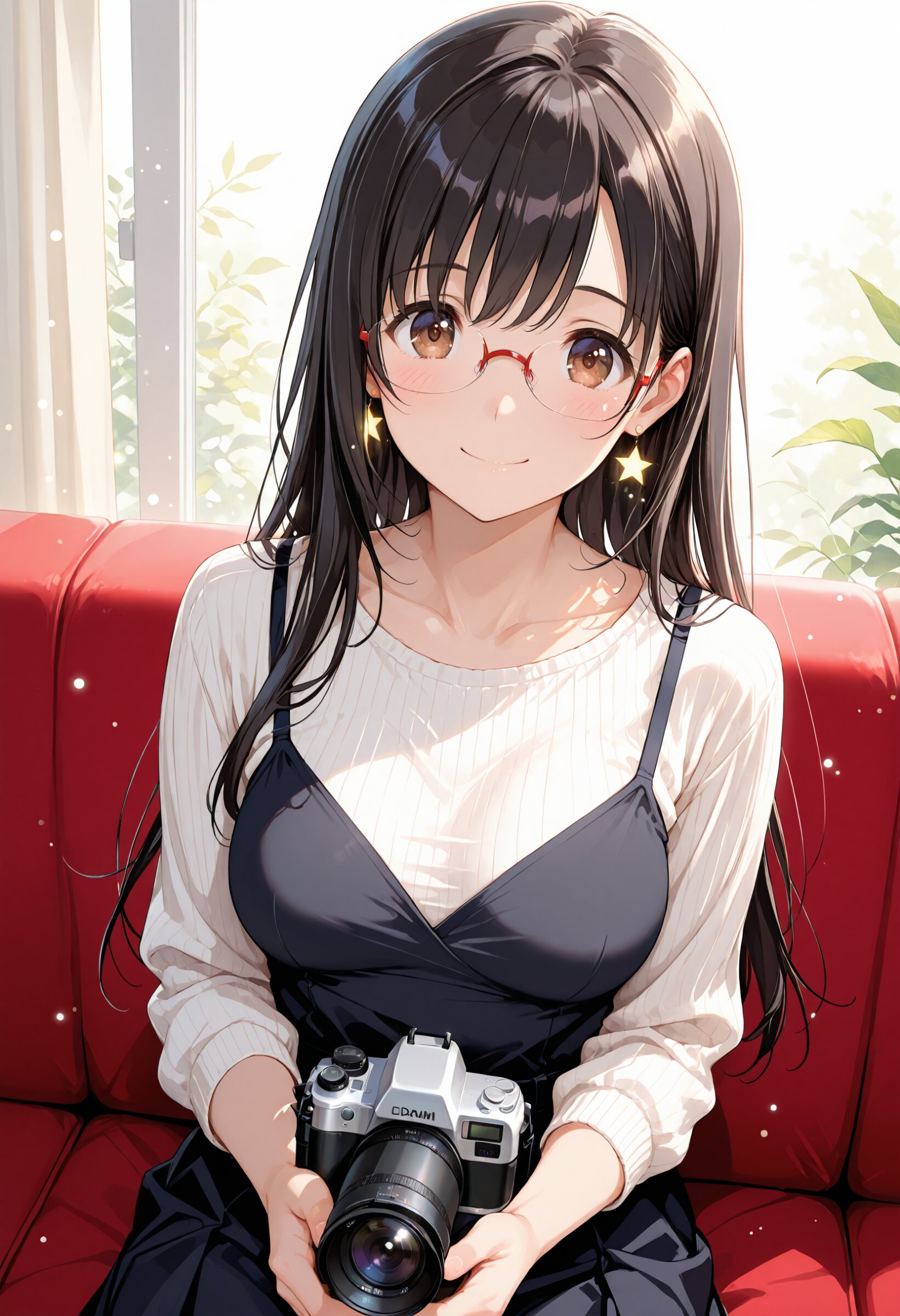 1girl, 17 years old, 155cm tall, brown eyes are shining and cute, black hair, long hair, extremely detailed neat hair,Straight hair, tareme, ((red semi-rimless eyewear:1.2)), star earrings, medium breasts, smile, blushful, happy, compassion, soft sunlight, lens flare, glowing particles, bokeh background, pastel color palette, translucent textures, shimmering light, delicate lines, dreamlike atmosphere. Masterpiece, best quality, high resolution, 4K, perfect anatomy, intricate details, official art, illustration, concept art, light novel cover art. detailed background, detailed clear line art,