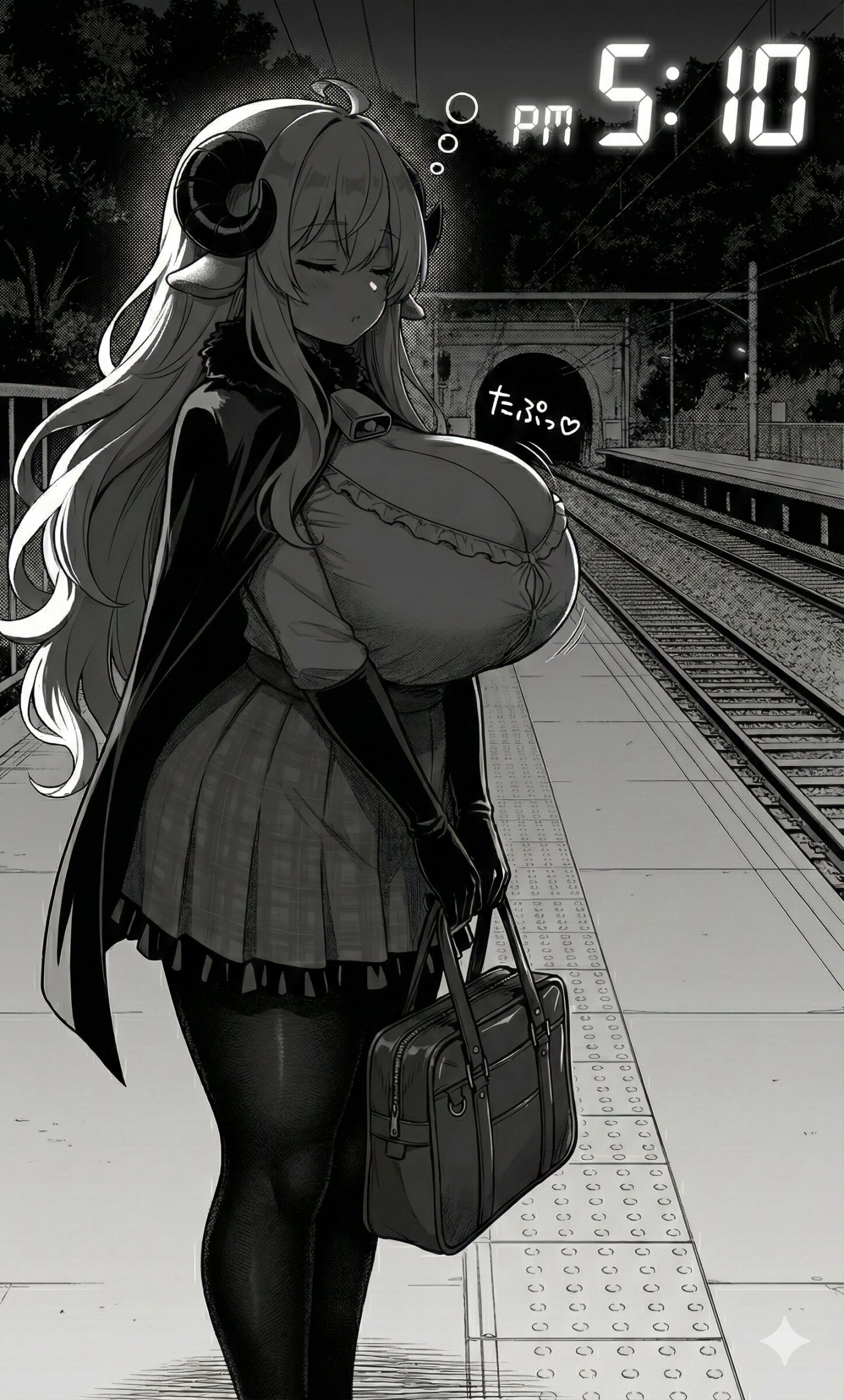 イラストのキャラクターをGペンでペン入れする。2D。白黒。背景に濃いスクリーントーンを貼っている。強めの陰影とコントラスト。線は細く薄くする。バストとヒップがとても豊満。キャラクターの特徴をそのままに、構図とポーズを変更する。夜の無人駅のプラットフォームに立っている。背景は夜の無人駅のプラットフォームと木々、奥にトンネル。奥の2番線の駅のプラットフォームと線路との段差を上げる。キャラクターは眠たげに鞄の持ち手を両手に持ち、点字ブロックの前に立っている。キャラクターを右側面から見る。黒タイツの質感向上。キャラクターから眠気の泡が出ている。右上の電灯を消去。完全に新しいイラスト。グラデーションを追加。 ▶︎ キャラクターの前面を暗くする。