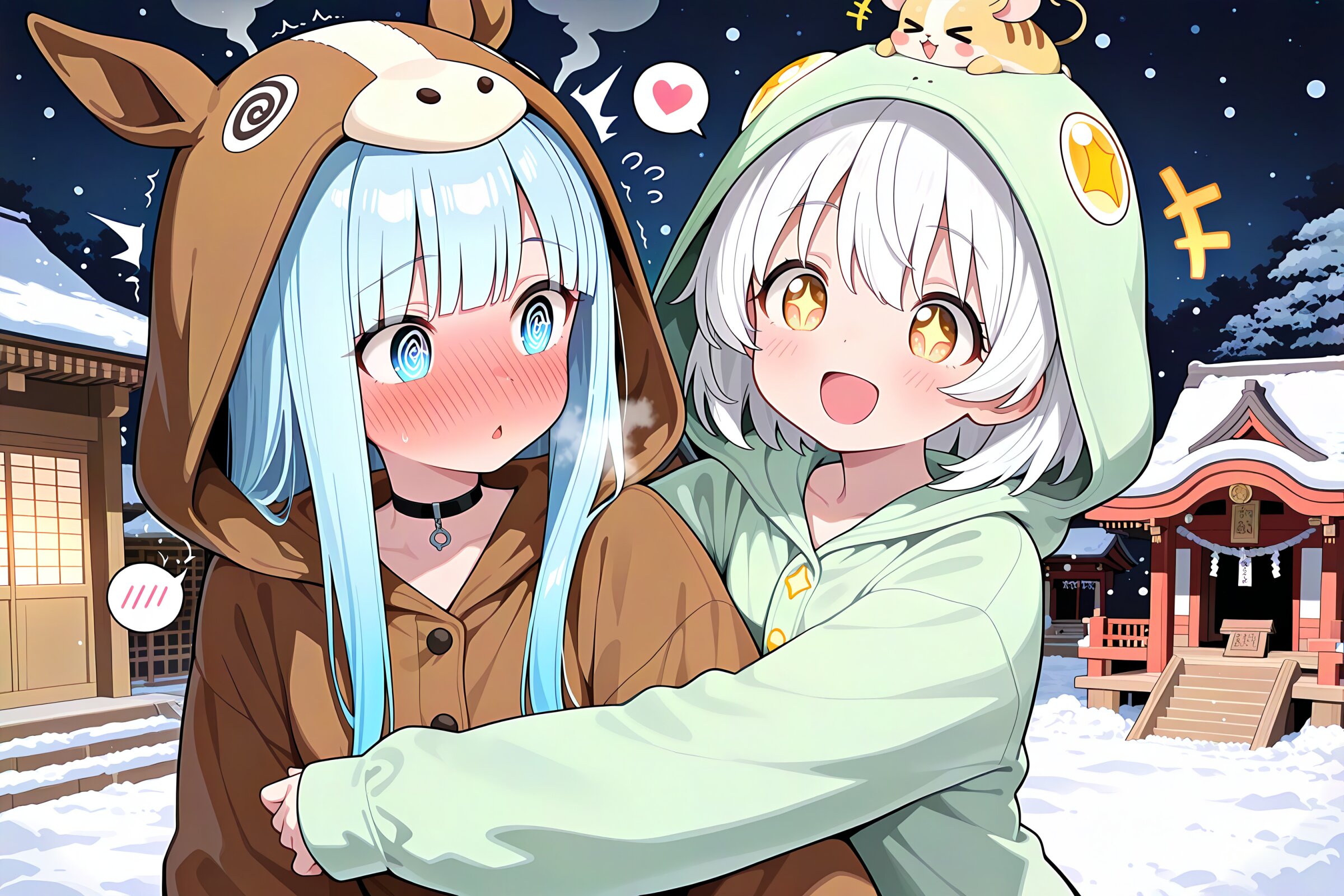 2 little girls, solo, symmetrical posture, upper body, masterpiece, best quality, amazing quality, very aesthetic, sky blue hair, long hair, straight hair, blue eyes, @_@, chestnut mouth, embarrassing, confused, blush, full-face_blush, head steam, trembling, ^^^, flying sweatdrops, spoken blush, choker, (horse costume:1.2), (hood on:1.2), night, japanese shrine, snow, BREAK 2 little girls, solo, symmetrical posture, upper body, masterpiece, best quality, amazing quality, very aesthetic, white hair, short hair, yellow eyes, +_+, open mouth, smile, cheerful, +++, notice lines, spoken heart, hamsters on her headwear, > <, choker, green snake pajamas, (hood on:1.2), hug from behind, night, japanese shrine, snow,