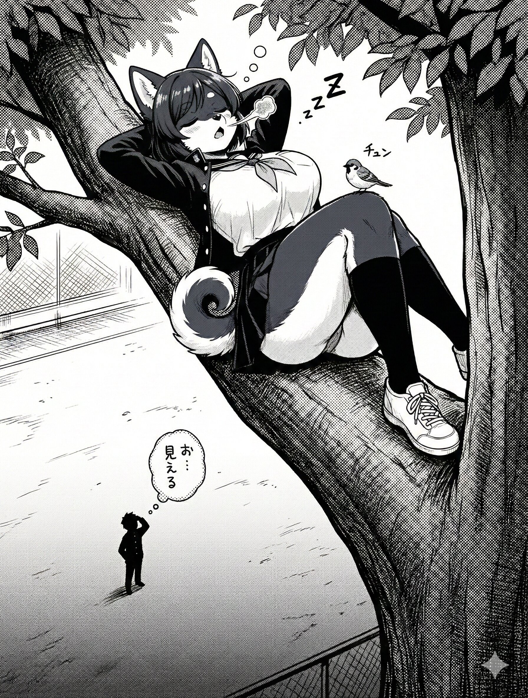 イラストのキャラクターをGペンでペン入れする。2D。カラー。背景に濃いスクリーントーンを貼っている。強めの陰影とコントラスト。線は細く薄くする。キャラクターは柴犬の耳と丸まった尻尾を持つ。キャラクターの陰影は濃い。バストとヒップがとても豊満。キャラクターの特徴をそのままに、構図とポーズを変更する。キャラクターは木の枝の上で目を閉じてスヤスヤ眠っている。仰向けになって両腕を頭の後ろで組んでいる。背景は朝、木と下に学校の土の地面。遠近感を出す。手前に木の枝の上で眠るキャラクター、奥に土。キャラクターを見上げる人影。黒い長靴下を穿いている。白いスニーカーを履いている。キャラクターは眠気の泡を出し、「Zzz」といびきをかいている。キャラクターの太腿の内側が白い毛、脚の外側が黒い毛。スズメが止まっており、「チュン」と小さく効果音を書く。完全に新しいイラスト。グラデーションを追加。 ▶︎人影から伸びる思考吹き出しに、小さく二段落で「お 見える」と手書き文字で書く。 ▶︎葉っぱが緑色。ネッカチーフが水色。セーラー服が白色。学ランとスカートが黒色。キャラクターの太腿の内側が白い毛、脚の外側が黒い毛。