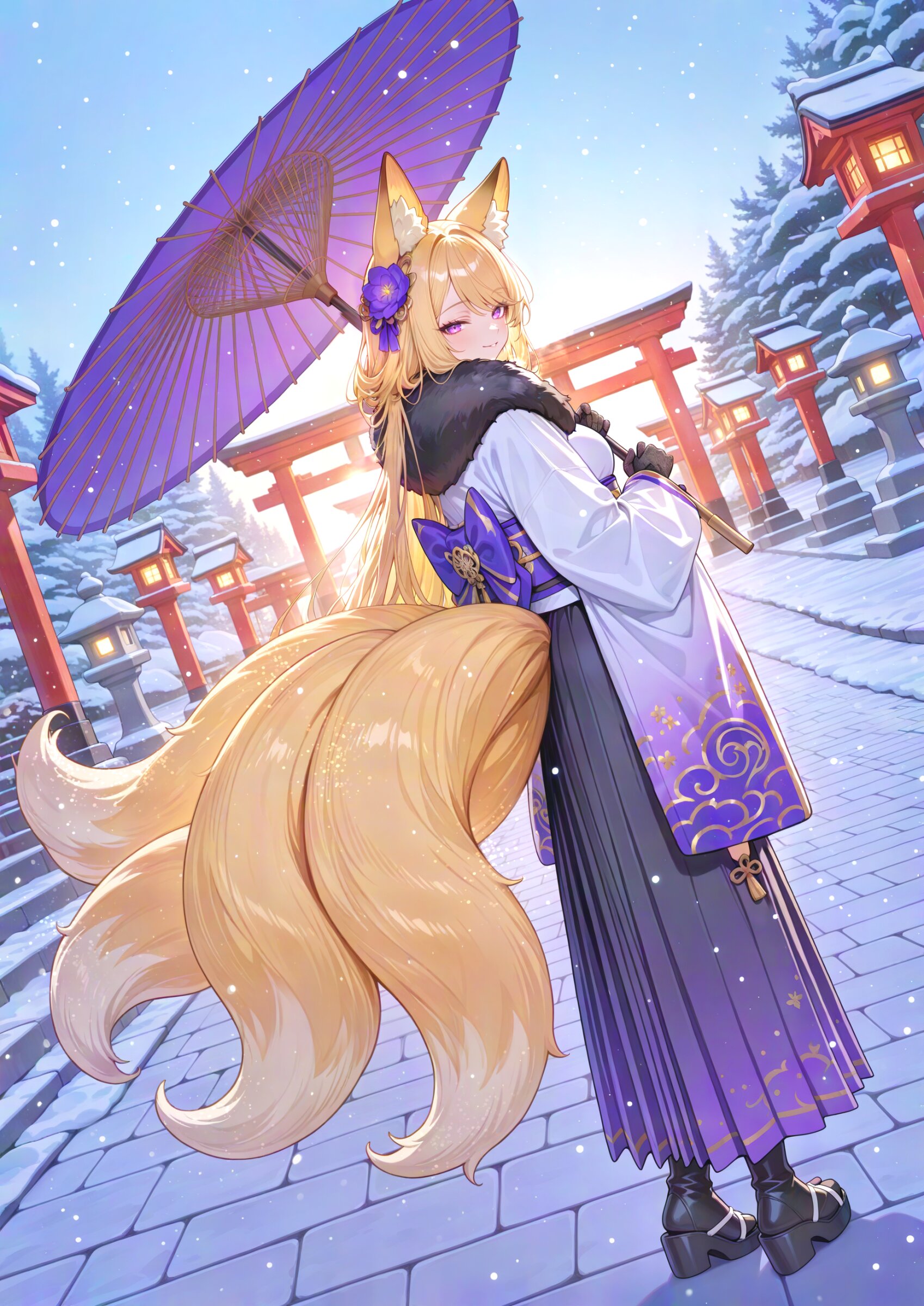 Over the Shoulder Shot, looking back, High Horizon, (face:1.0), dutch angle, looking at viewer, (simple watercolor background:1.1), drop shadow, colored shadow, blue sky morning light, The background is a solid, bright warm colored gentian blue, creating a striking contrast with the intricate, multi-colored design of the character, (ink wash effect:0.9), pop color background, (high saturation:1.2), winter coloring, winter atmosphere, divine atmosphere, sacred aura, morning torii, shrine, stone floor, stone lantern, komainu, snowing, 1girl, fox girl, gold Blond Hair, large breasts and fox ears, (swept bangs:1.2), (perfect purple eyes:1.3) long eyelashes aristocratic features tall girl has (Blond Hair long hair over ears:1.3) fox 9tails, (wearing White Japanese Cloth straw sandal black silk gloves long skirt Obi boots:1.3), hair ornament flower, tabi, long sleeves, winter scarf, (fur trim:1.1), black thighhighs, mysterious atmosphere, seductive smile, closed eyes, comfy, oil-paper umbrella, new year theme, super fine concept art, unreal engine, graceful eyes, masterpiece, best quality, amazing quality, very aesthetic, absurdres, newest, professional art lots of details, , overexposure, sumie effect style, 4ur4_illu,shiny, glowing, glowing particles, glowing light particles, light particles, soil, <lora:noline (1):-0.5> <lora:sdxl2-flat2-512b:-0.2> <lora:facelightup_xl_v10:0.5> <lora:V2_yakumo_alchemy:0.5> <lora:Aura_illu:0.1>