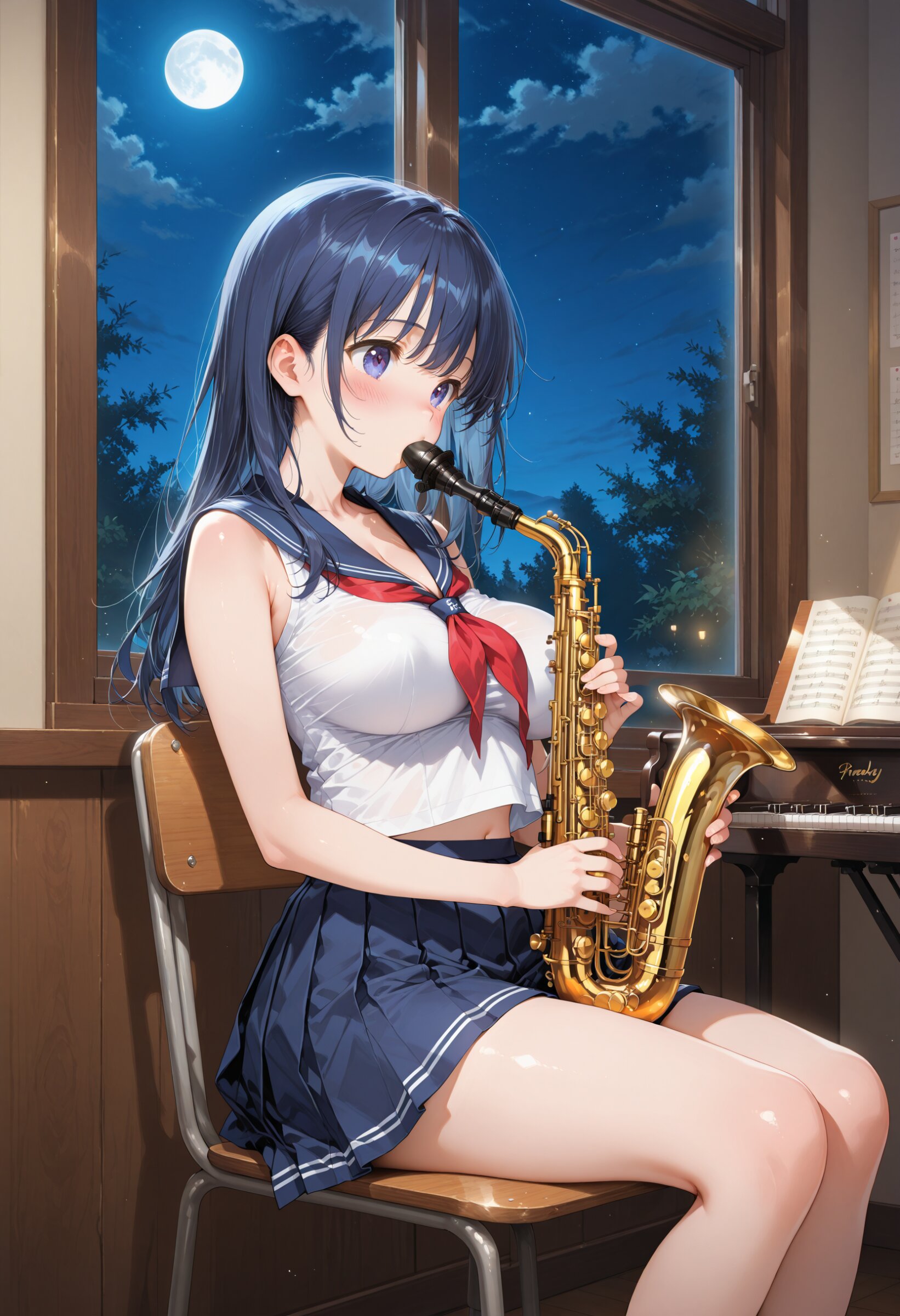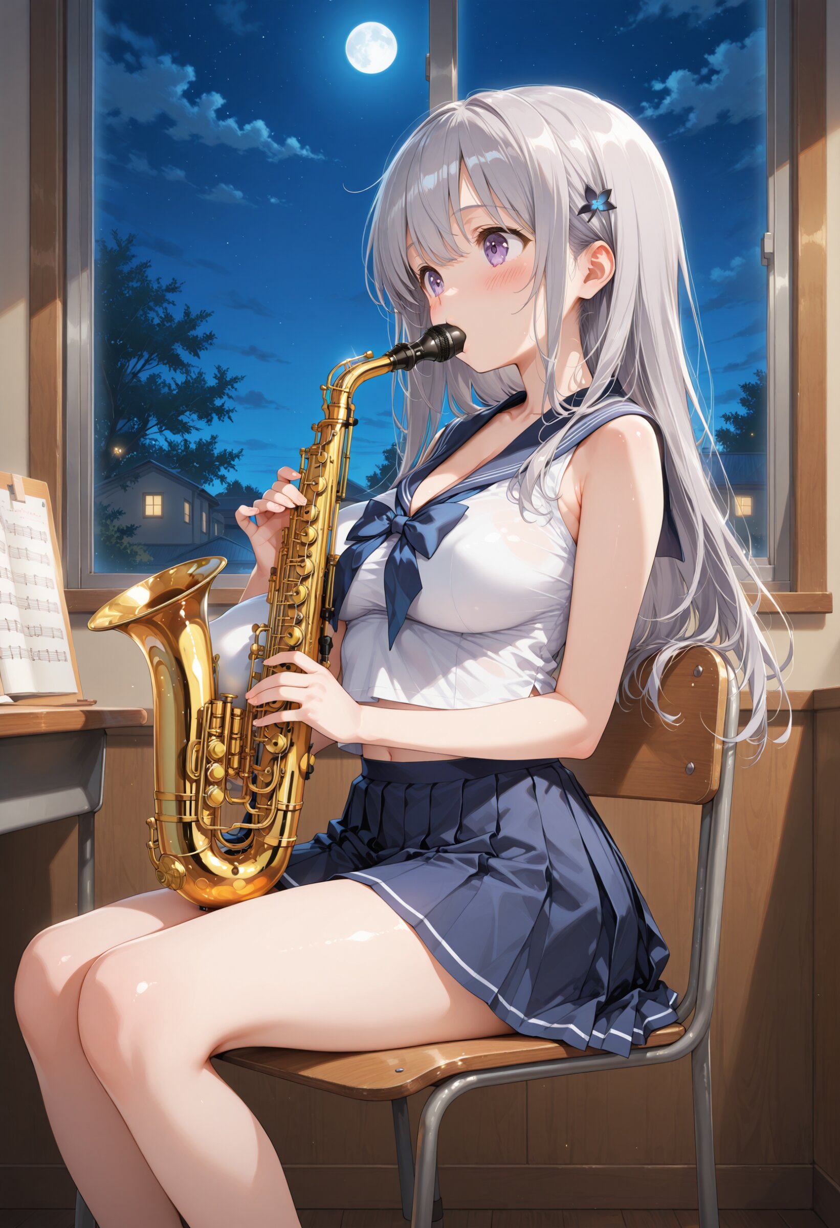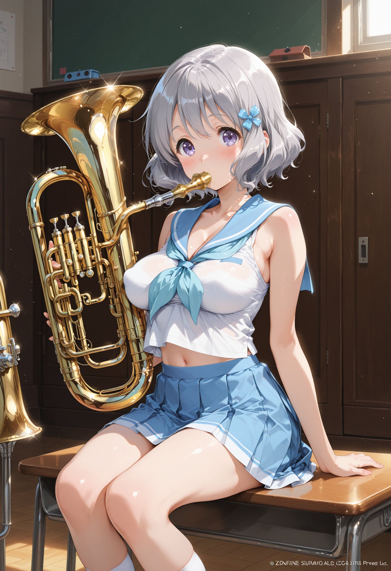 masterpiece, best quality, amazing quality, general, fine detail, official art, 1girl, loli, silver hair, school sailor uniform, sleeveless, miniskirt, midriff peek, cleavage between sailor collar, beautiful legs, big breasts, impossible clothes, (perky breasts:1.2), school music room, sitting, playing Euphonium, Place lips on the mouthpiece, blush,