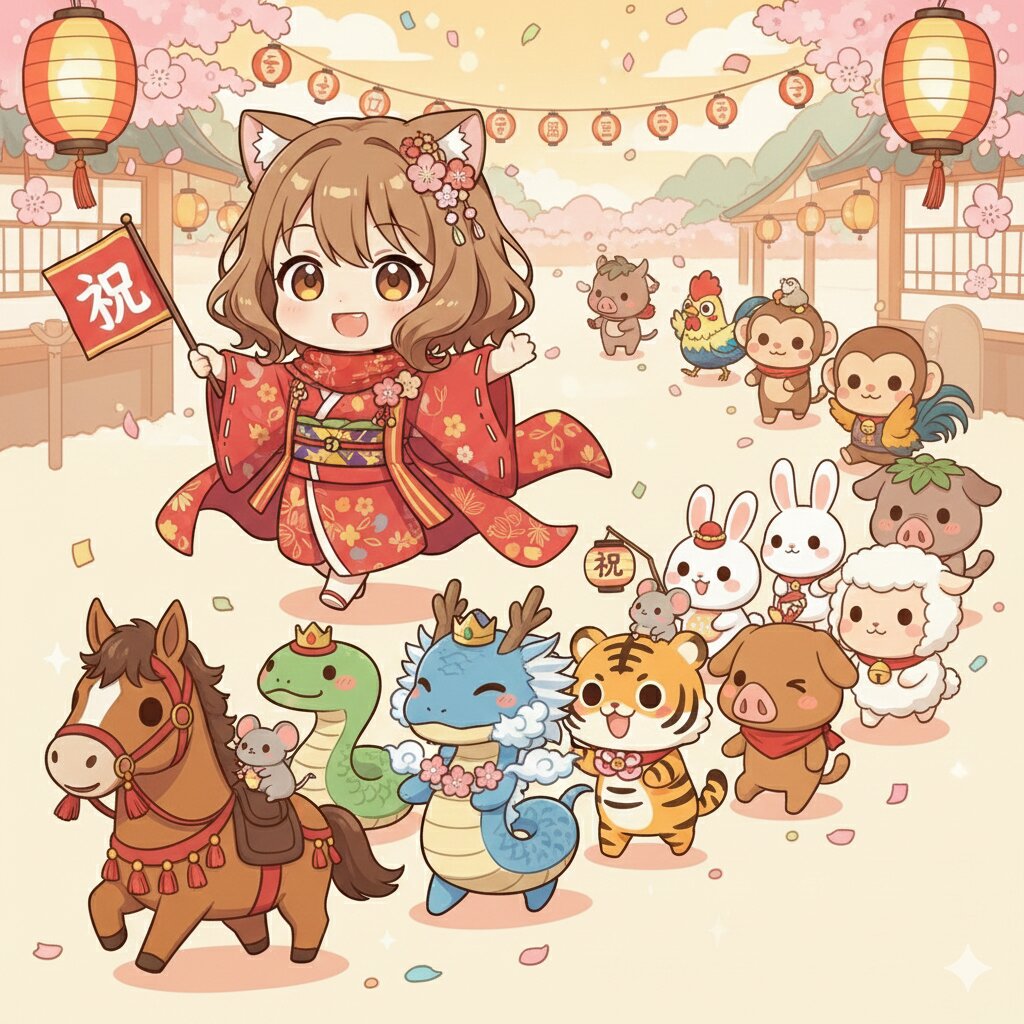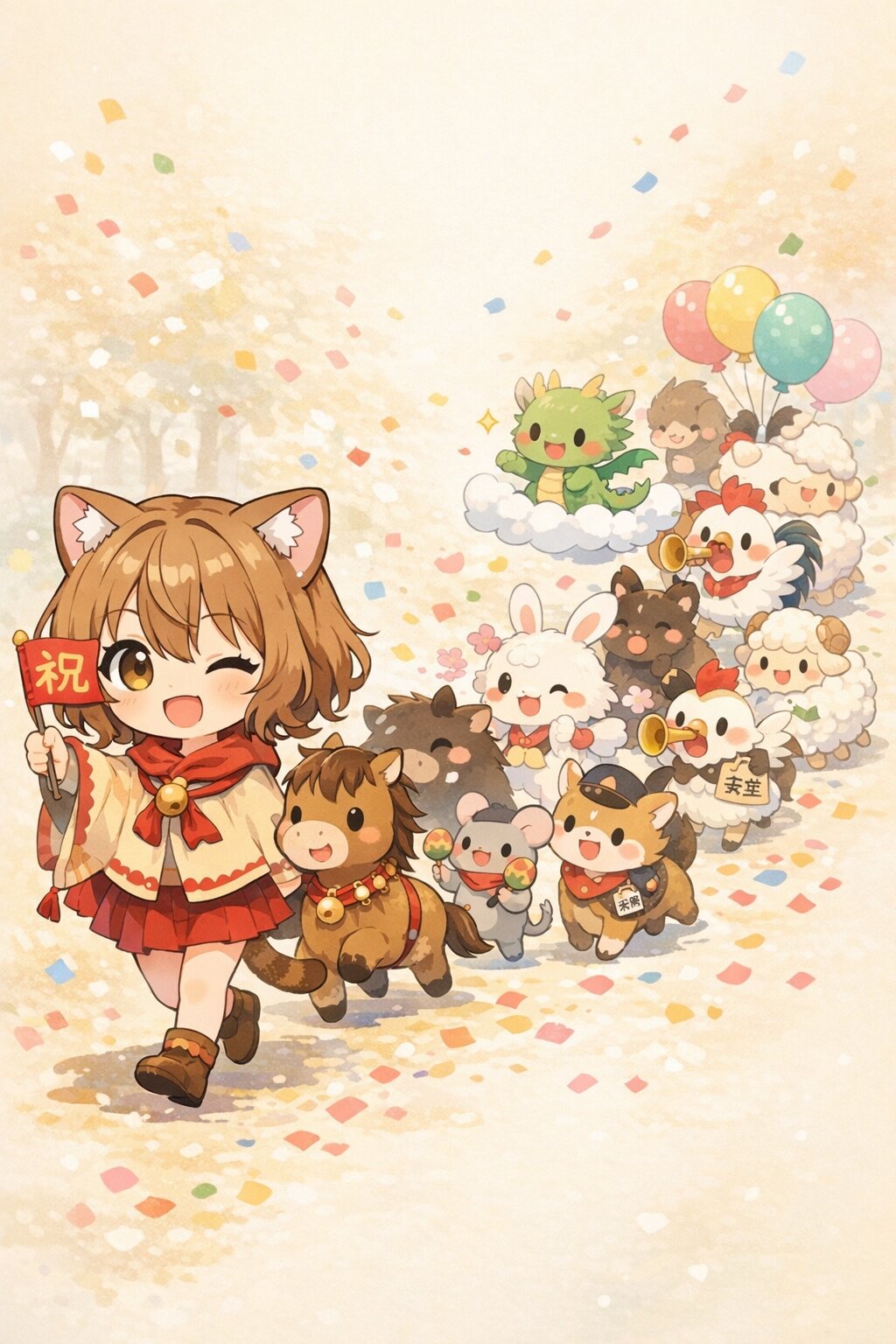「十二支パレード」テーマのデフォルメちびキャラの可愛く楽しい祝祭イラスト。雰囲気に合った祝祭の背景。 先頭にはツアーガイド役の茶髪の猫耳娘「ミミ」。 赤を基調にしたお祭り風の服装(スカーフやケープ風)、小さな和風の髪飾り、小さな旗に「祝」の文字。 元気よく旗を振りながらパレードを先導している。 ミミのすぐ後ろから、十二支の完全動物キャラクターたちが列になって続いて楽しそうに行進している。画面全体を活かした配置。 並び順(前から後ろ)は以下の通り: 1. 馬 2. 蛇 3. 龍 4. 兎 5. 虎 6. 牛 7. 鼠 8. 猪 9. 犬 10. 鶏 11. 猿 12. 羊