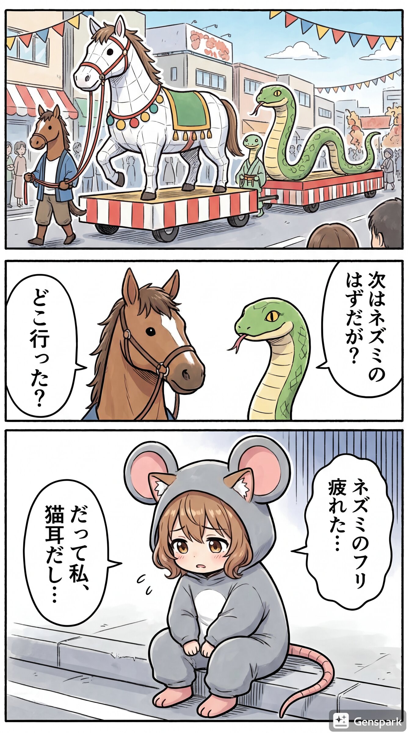 「十二支パレード」テーマに、茶髪の猫耳娘が登場するユニークな短編漫画を作って。セリフはすべて日本語。右から左へ読むことを前提としたセリフ配置。キャラの服はネタに合うものに着替えさせて。 パレードの先頭は馬、その後ろに蛇。