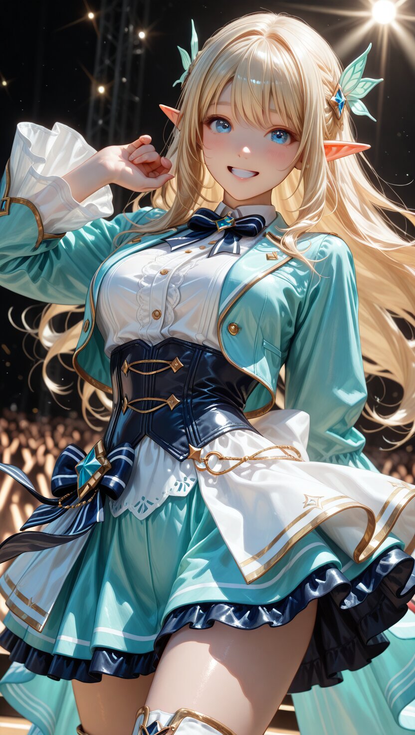 (official illustration, soft lighting, idol outfit, stage style, solo, idol stage pose), beautiful elf girl, blonde hair, apatite eyes, long hair, smiling, cheerful expression, cowboy shot, from front, singing and dancing. dynamic angle, dynamic composition, modern idol costume with cute decorations, short skirt, fitted jacket, ribbon belt like corset, idol boots, slightly flared sleeves, stylish silhouette, balance of western and japanese elements, glossy satin fabric, sheer organza overlay, metallic highlights, hair accessory, soft white background, high detail in costume texture. apatite color clothes. (close-up eyes, breast focus),, anime style, anime color,, masterpiece, amazing quality, very aesthetic, high resolution, ultra-detailed, absolute, newest, 2d, semi-realistic, moe heroine, sharp focus,, <lora:elf-san_alpha1(AnimagineV31):0.7> <lora:elf-san_alpha4(IL1.0):0.7>