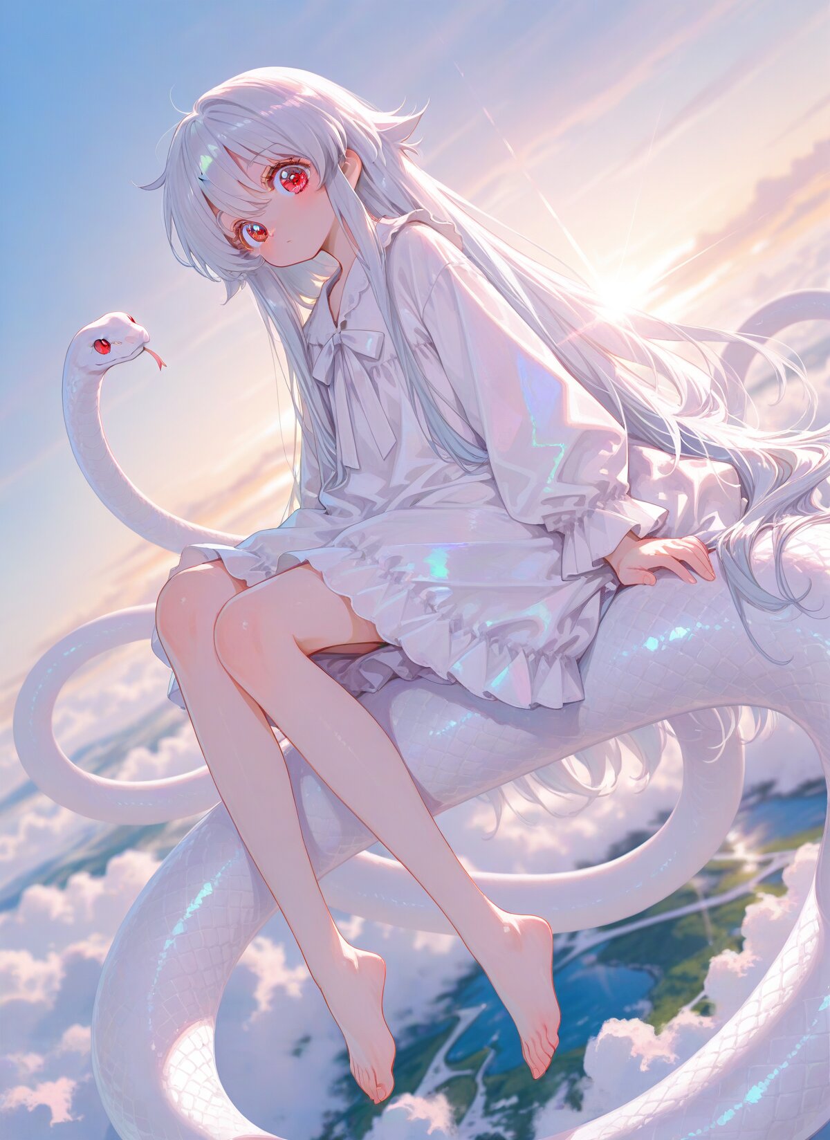 雲の海を黄金色に染める朝日が、私の真っ白なワンピースを優しく照らしてくれるの。 この大きな蛇さんはね、とっても冷たくて、でも驚くほど温かい私の大切な守護者。