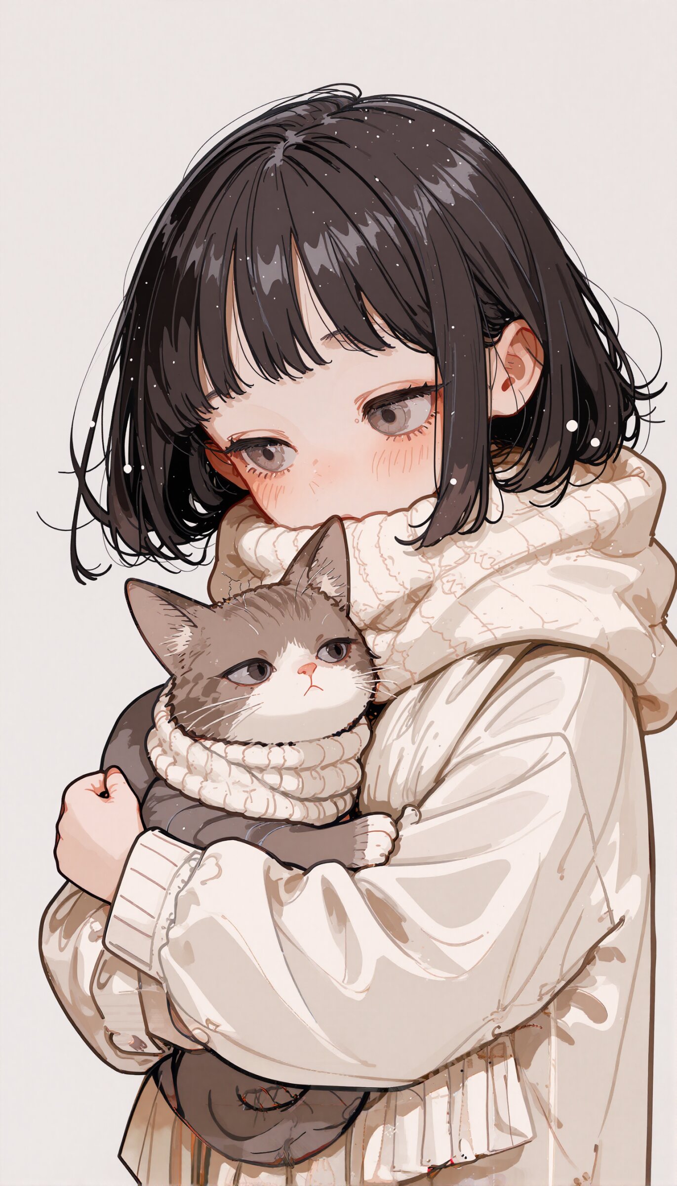 A vertical illustration, centered composition. Keep the character within one-third of the screen. Leave space at the top that is 60% of the image's height. A cute illustration of a girl in a thick scarf holding a small cat in her arms. The cat also wears a tiny knitted scarf, both of them surrounded by drifting snowflakes. The mood is tender, warm, and playful against the cold winter backdrop.