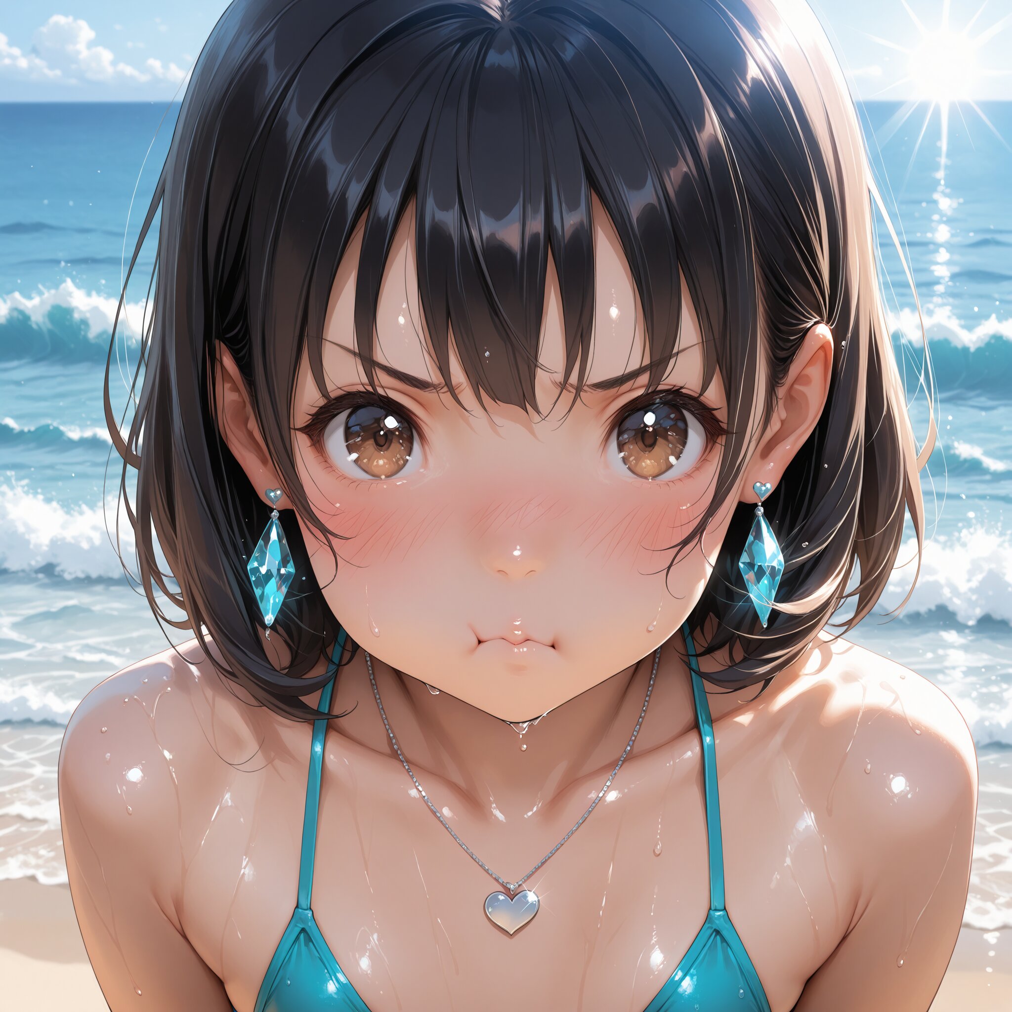 masterpiece, best quality, photorealistic, sharp focus, cinematic lighting, depth of field, beautiful composition, vibrant colors, ultra high res, 8K, highly detailed, masterpiece, best quality, very detailed, (masterpiece:1.2), (best quality), (ultra-detailed), 1girl, solo, little girl, elementary school student, close-up, pov, looking at viewer, pouting, puffed cheeks, blushing, short black hair, brown eyes, wet skin, glistening, wearing cyan bikini, heart necklace, crystal earrings, sunny beach background, ocean waves, bright sunlight, cinematic lighting, sharp focus.