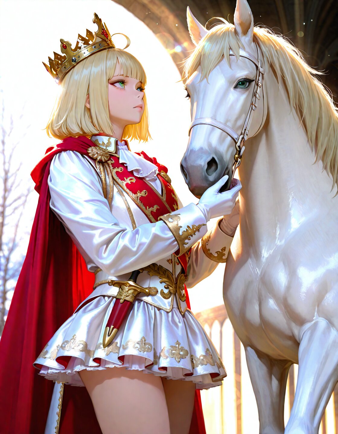 solo,1boy,ahoge,green eyes,blonde hair,short hair, straight hair, blunt bangs,hime cut,delicate hair,detailed hair, delicate face,detailed face,cute face,detailed skin,masterpiece,best quality,insanely detailed,beautiful, 16k,photorealistic, prince charming,(White luxurious Prince costume:1.5),(Red luxurious Cape:1.3),long sleeves,(luxurious crown on head:1.5),(white luxurious gloves),(white luxurious mini skirt:1.5),(dagger on waist), expressionless,(with a white horse:1.3),looking up at horse face,medieval europe,in the afternoon,classic academia,lens flare,winter,sunlight,sunbeam,soft lighting,in focus with blurred background, face focus, from side,cowboy shot