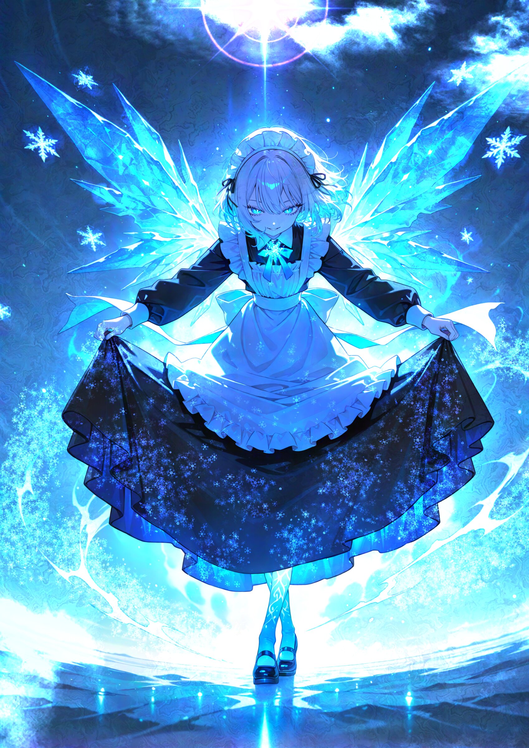 front view, (fisheye,fisheye lens angle:1.0), (from below:1.15) looking at viewer, (dutch angle:1.2) winter atmosphere, earthy color, winter theme, 1girl, (ultra-detailed), solo, maid, pale skin, pale cool colored violet hair, (beautiful slit pupils, naughty face:1.0), long sleeves classic maid uniform, long skirt, maid headdress, maid apron, luminous effect lens flare shiny-glistening cute girl solo full body, standing, crossed legs, skirt lift, graceful courtesy, bowing (blizzard aura, ice wings, snowflakes, midair, flying, :1.1), super fine concept art, 8K, graceful eyes, masterpiece, best quality, amazing quality, very aesthetic, absurdres, newest, professional art lots of details, , overexposure, sumi-e effect style, 4ur4_illu,shiny, glowing, glowing particles, glowing light particles, light particles, light particles, <lora:noline (1):-0.5> <lora:sdxl2-flat2-512b:0.15> <lora:facelightup_xl_v10:0.5> <lora:V2_yakumo_alchemy:0.5> <lora:Aura_illu:0.1>