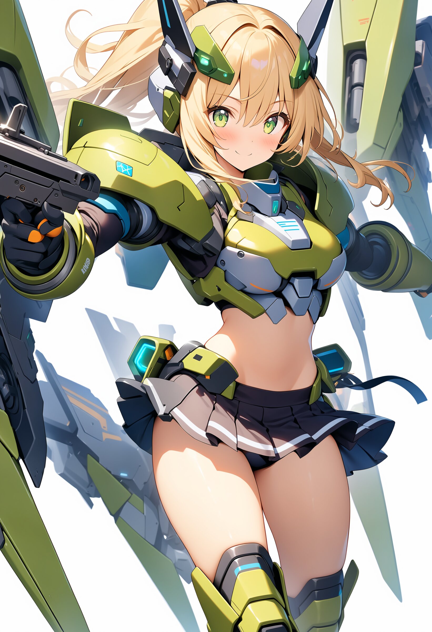 1girl, ((white background)), ultra detailed 8k cg render, masterpiece, high resolution, extremely detailed, mecha musume,mecha shoulder, mech leg, headgear, mecha armor, ((mini skirt)),long blonde hair, dropping green eyes, smile, dynamic posing,