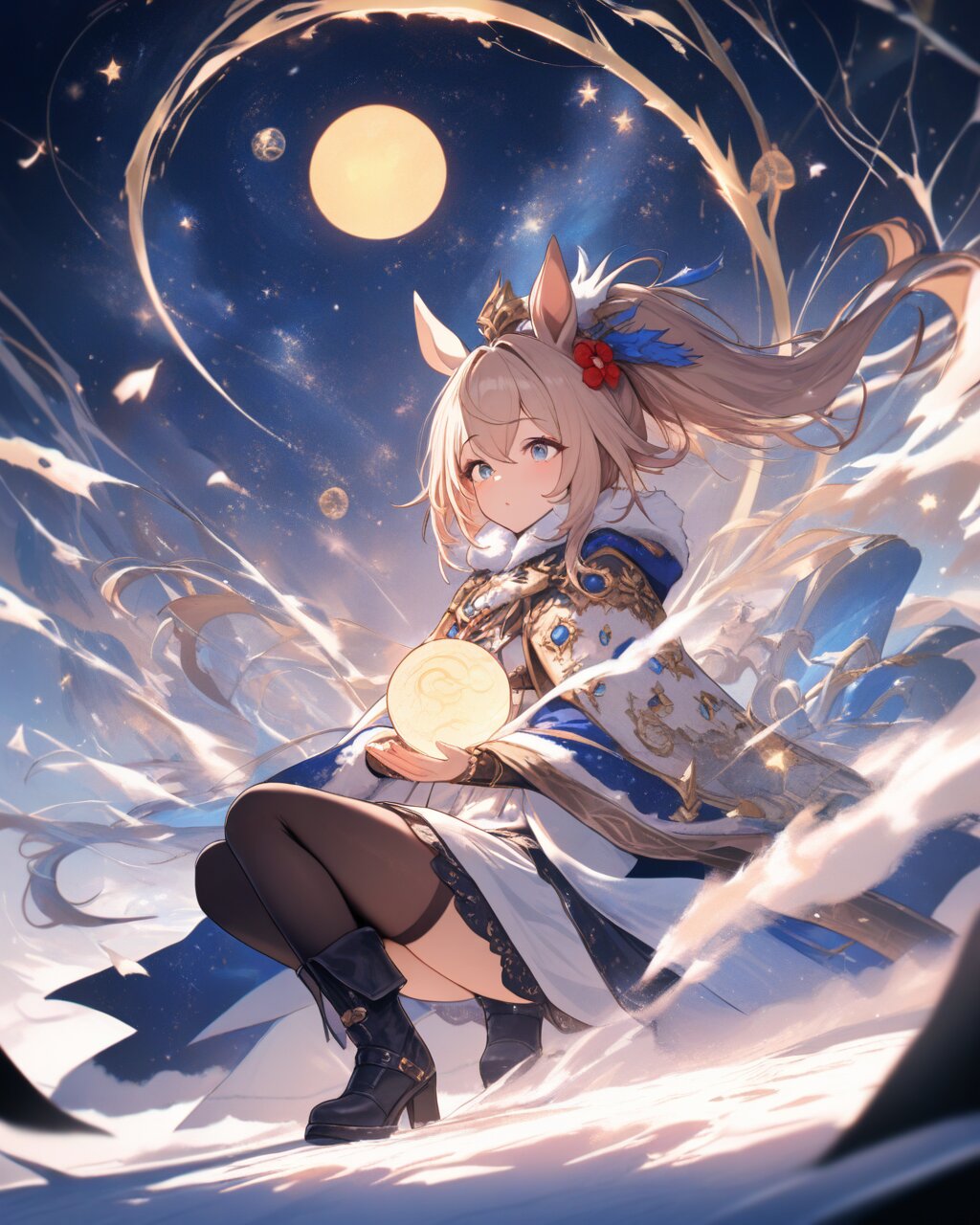 1horse girl, chibi, winter clothes, black thighhighs, boots, twelve Chinese zodiac sign, celestial world, fantasy, masterpiece, absurdres, high score, great score