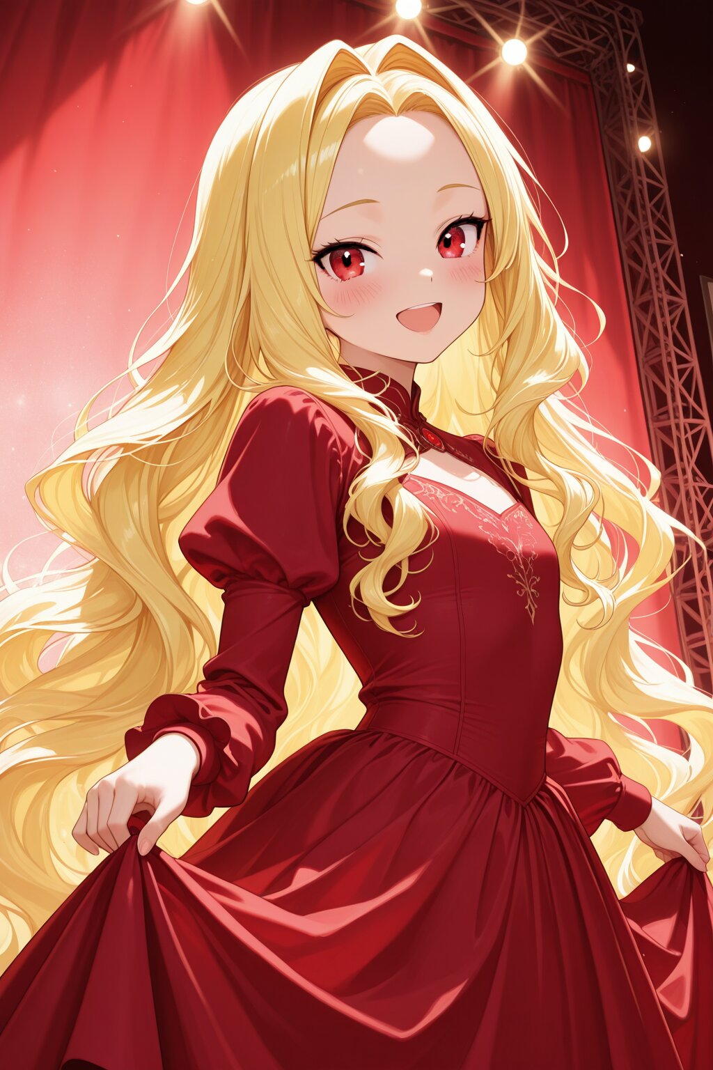 1girl, red theme,spot light,stage lights, (tall:1.3),(young),slender,slender small face, flat chest, (lemon yellow hair),absurdly long hair,(small forehead),(hair intakes:1.3),wavy hair,sideburns, (garnet red eyes),Jig eyes,(tsurime), blush,smile,joy,open mouth, red long dress,fluttering hair,the fluttering dress, curtsey, upper body,dynamic angle,looking at viewer,from side:0.8, ((best quality)),amazing quality,((very high resolution)),very aesthetic,((ultra detailed)),absurdres, full color,extremely detailed CG,super fine illustration, perfect anatomy,perfect hands,super detailed skin, (beautiful eyes,detailed eyes,perfect eyes,eye reflection),high-quality face,extremely detailed face, anime style,
