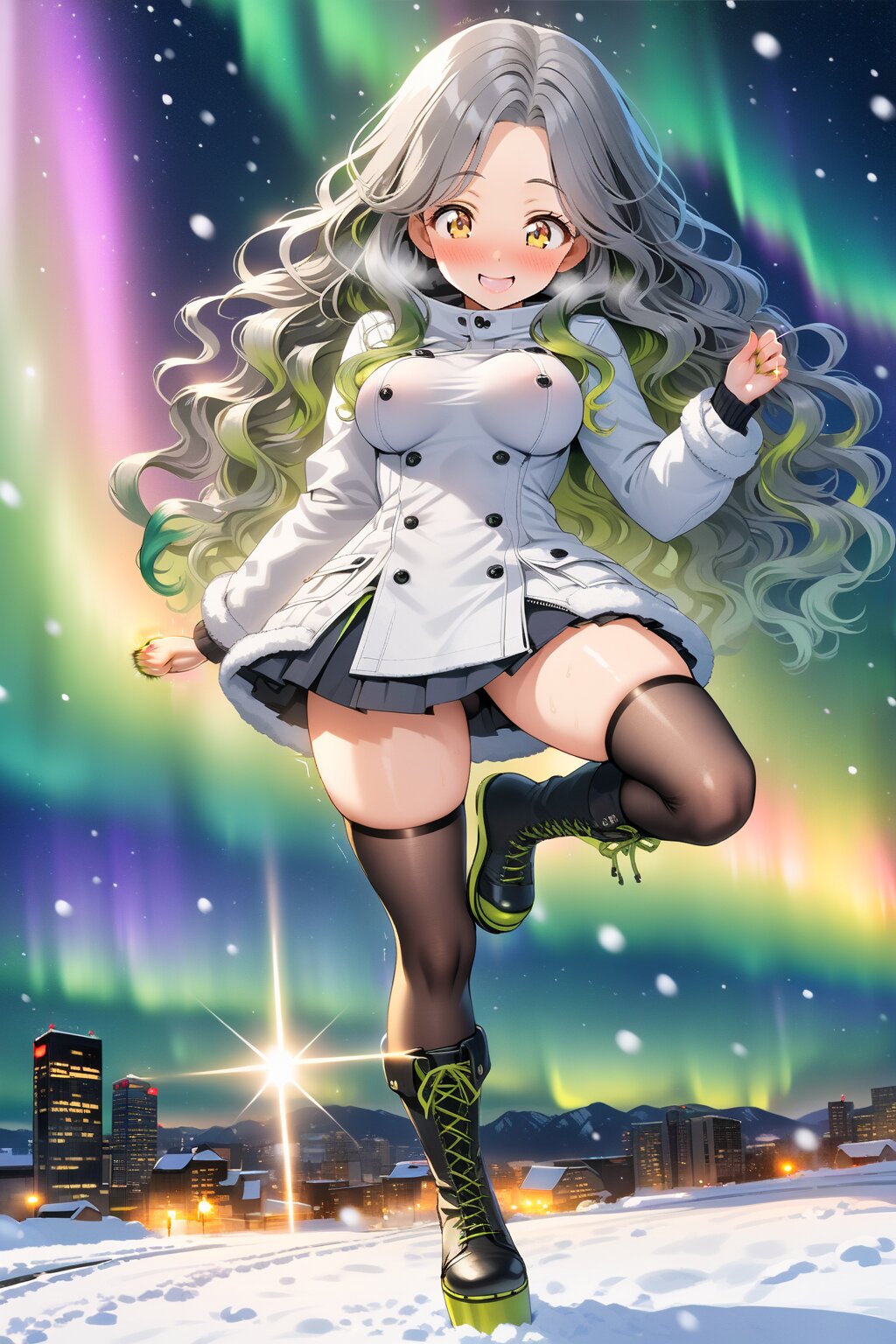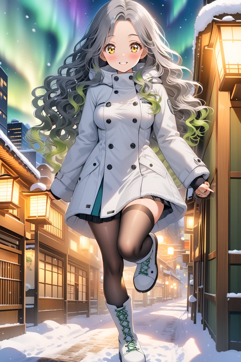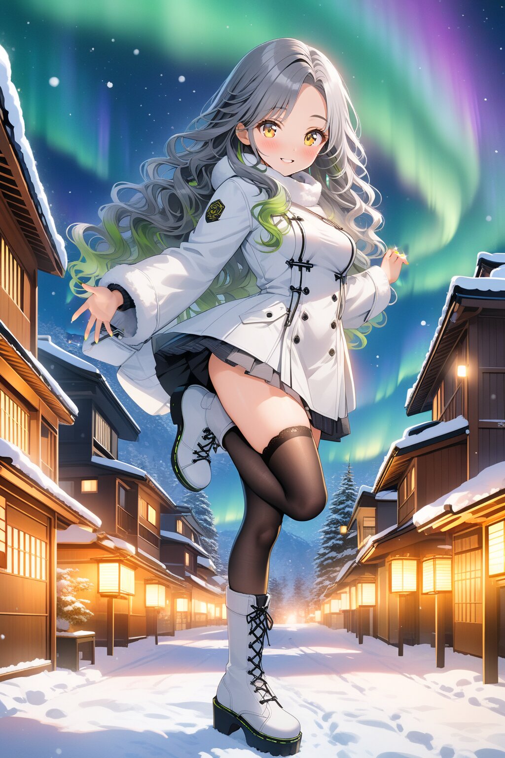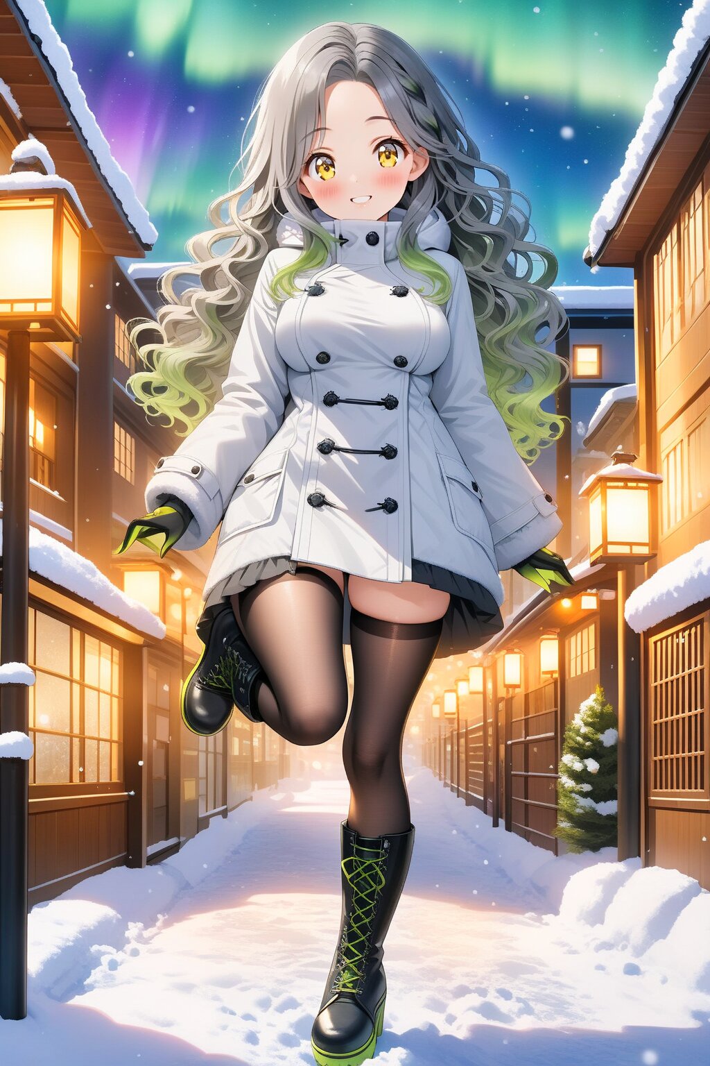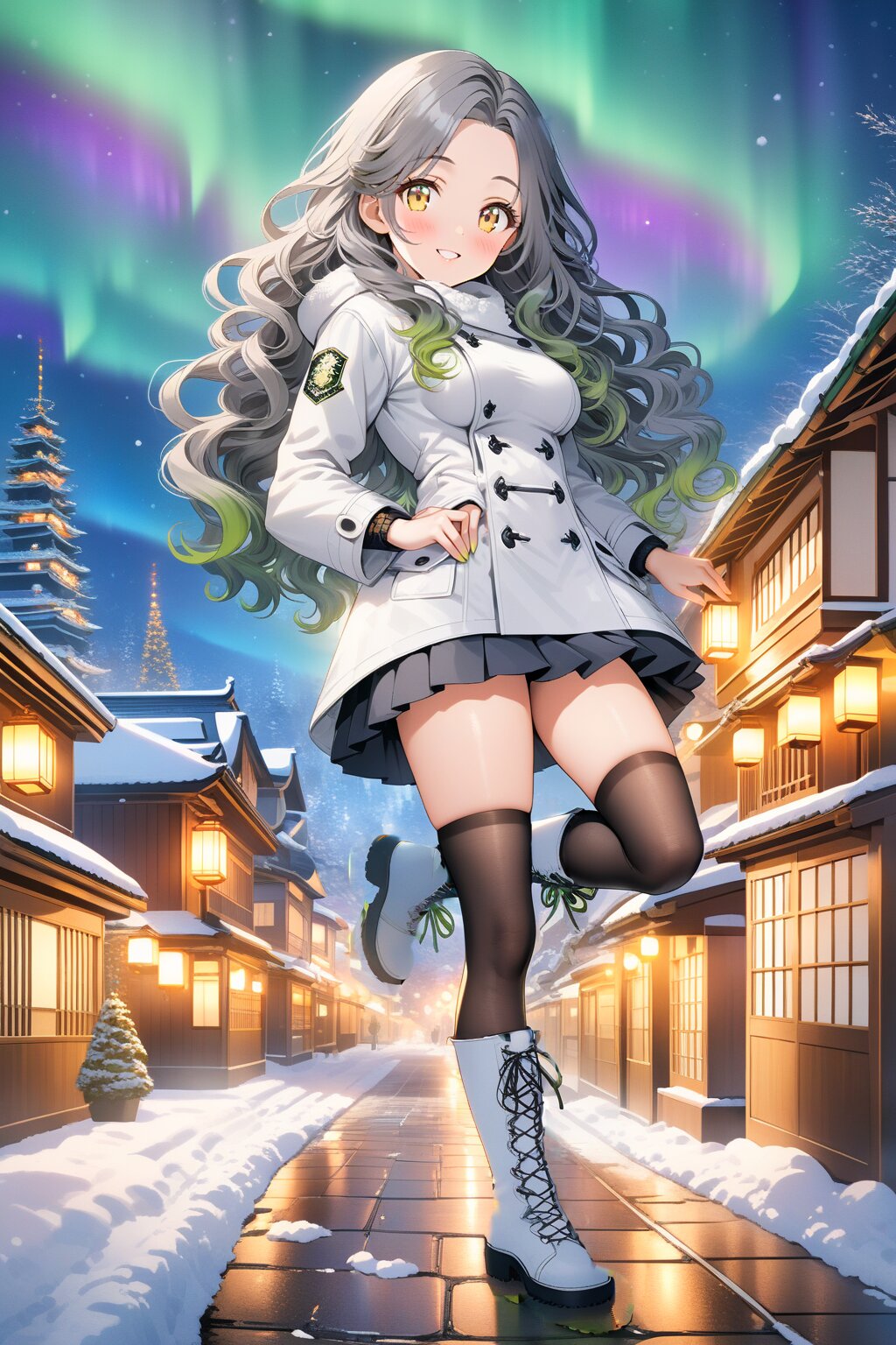 (full body:1.4), 1girl, solo, (standing, (standing on one leg:1.1)), (dark grey hair:1.3), (from dark grey roots to green tips:1.4), (long wavy hair:1.3), (parted bangs:1.3), (yellow eyes:1.2), japanese_girl, (medium breasts:1.3), (gleaming skin:1.4), smile, blush, BREAK (white theme:1.4), (white duffle coat with double-breasted:1.4), (closed button:1.3), (A-line:1.3), (black thighhighs:1.3), (white lace-up boots:1.4), (white knee boots:1.4), (ankle boots:-1), (((city, snow, winter, morning):1.3), (aurora lights:1.2)), ((8K, masterpiece ,best quality ,ultra-detailed)), game cg, masterpiece, (perfect face:1.1025), (perfect hands:1.1025), (perfect legs:1.1025), (perfect arms:1.1025), (perfect fingers:1.1025), <lora:xl_more_art-full_v1:0.6> <lora:add-detail-xl:1>,