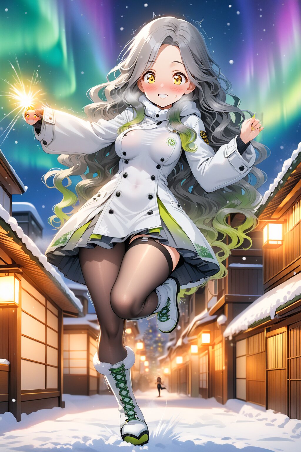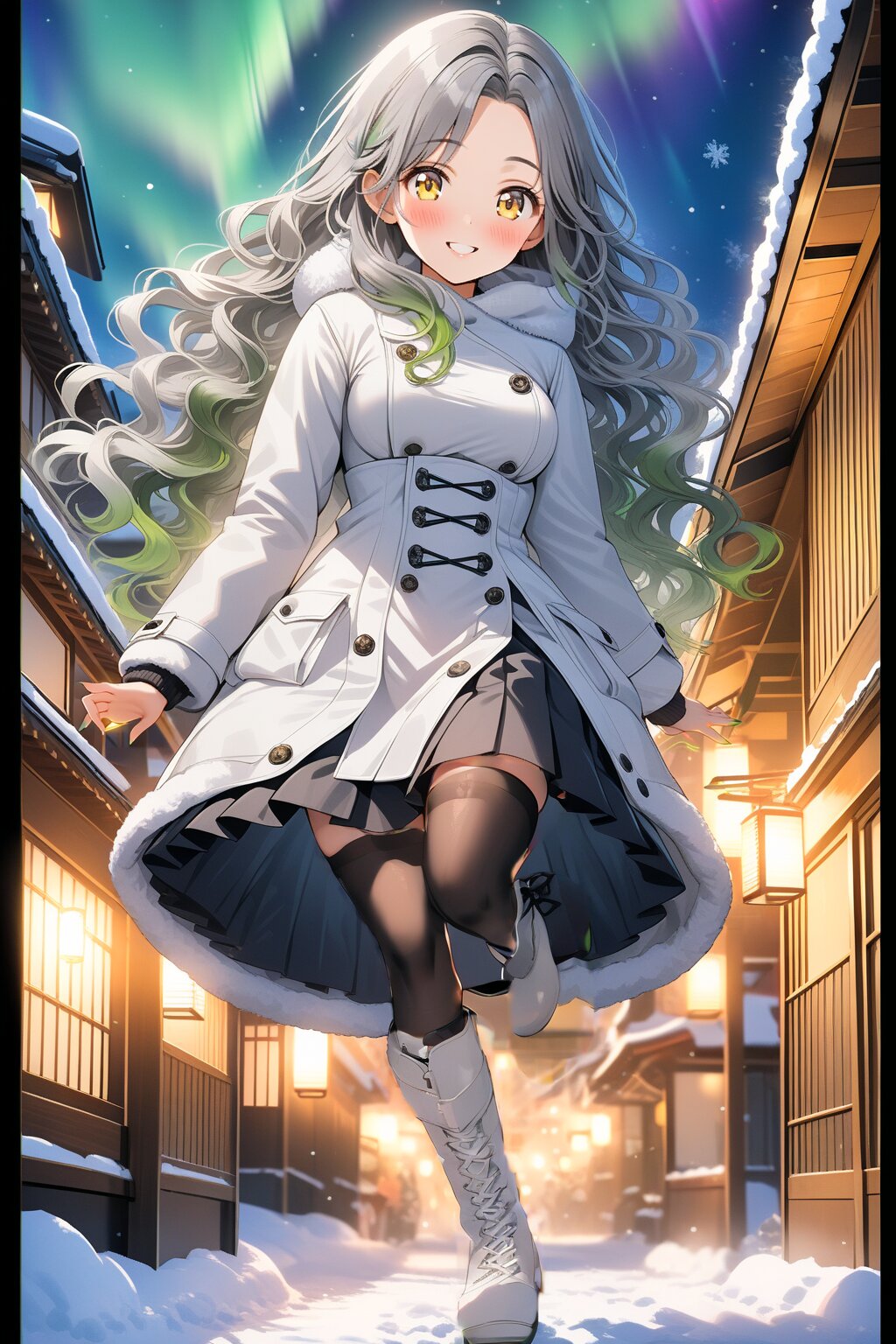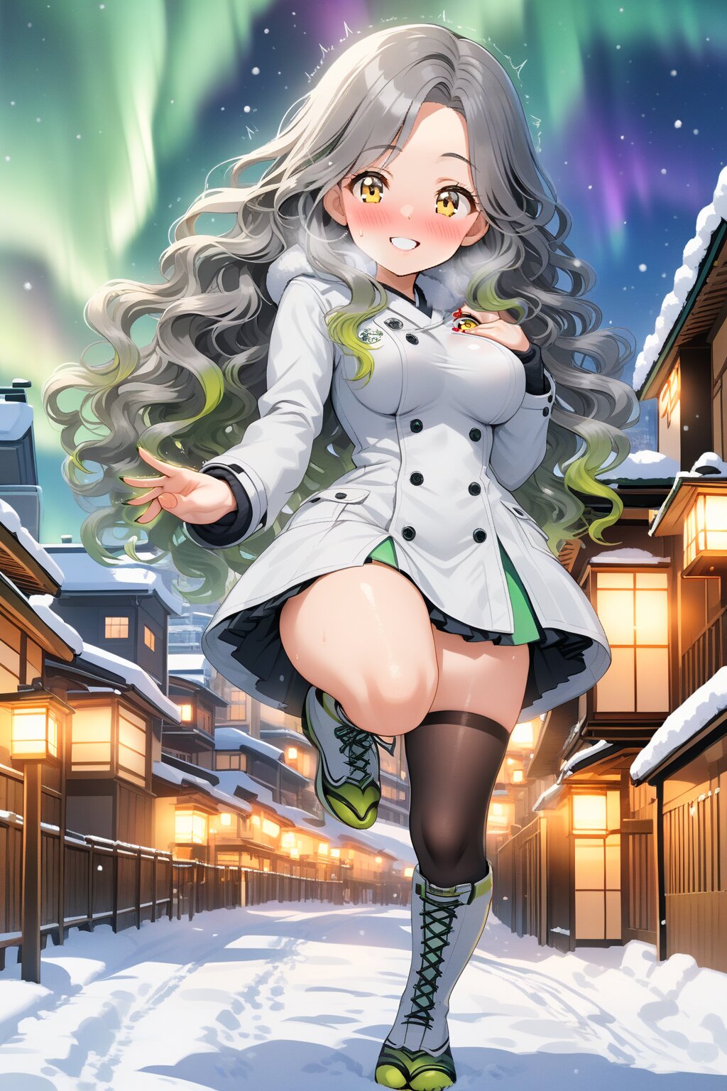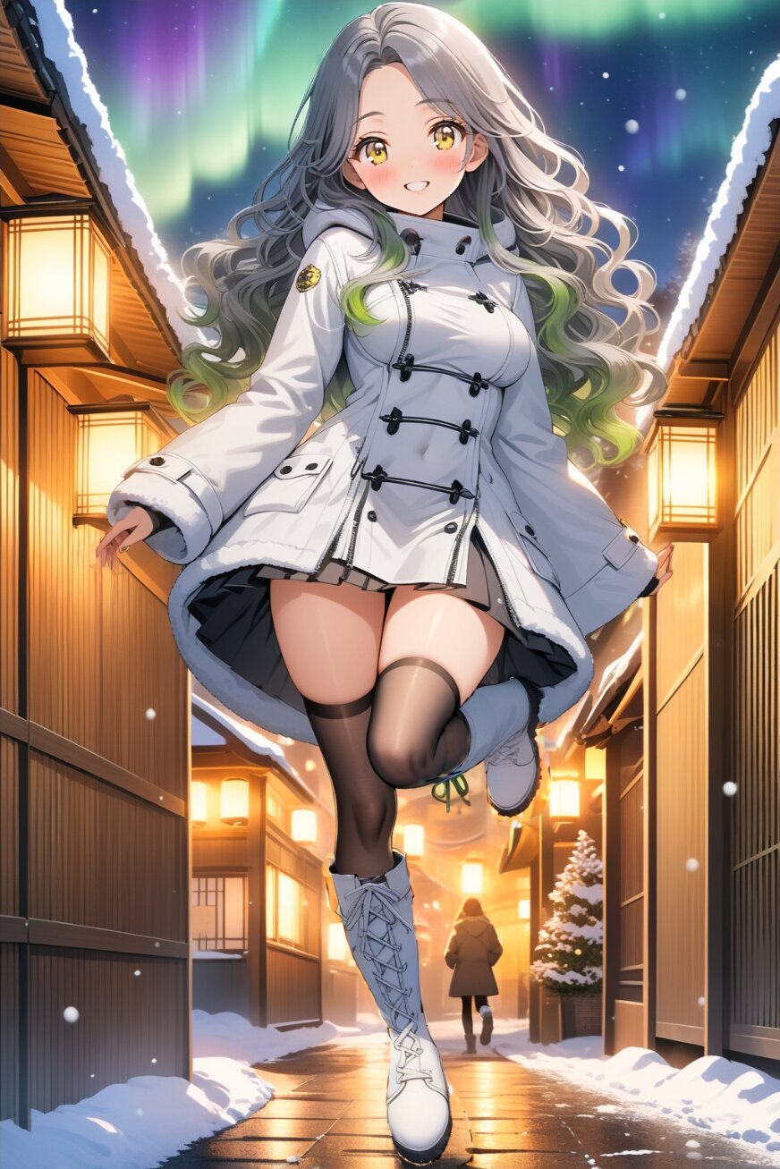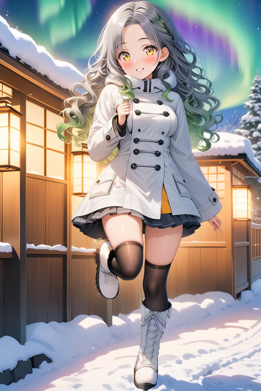 (full body:1.4), 1girl, solo, (standing, (standing on one leg:1.1)), (dark grey hair:1.3), (from dark grey roots to green tips:1.4), (long wavy hair:1.3), (parted bangs:1.3), (yellow eyes:1.2), japanese_girl, (medium breasts:1.3), (gleaming skin:1.4), smile, blush, BREAK (white theme:1.4), (white duffle coat with double-breasted:1.4), (closed button:1.3), (A-line:1.3), (black thighhighs:1.3), (white lace-up boots:1.4), (white knee boots:1.4), (ankle boots:-1), (((city, snow, winter, morning):1.3), (aurora lights:1.2)), ((8K, masterpiece ,best quality ,ultra-detailed)), game cg, masterpiece, (perfect face:1.1025), (perfect hands:1.1025), (perfect legs:1.1025), (perfect arms:1.1025), (perfect fingers:1.1025), <lora:xl_more_art-full_v1:0.6> <lora:add-detail-xl:1>,