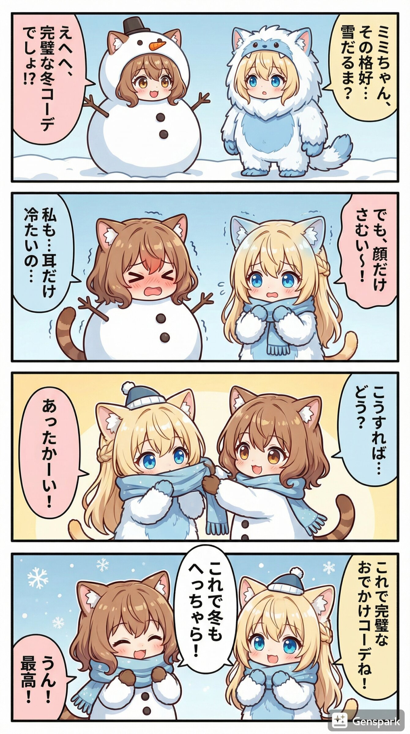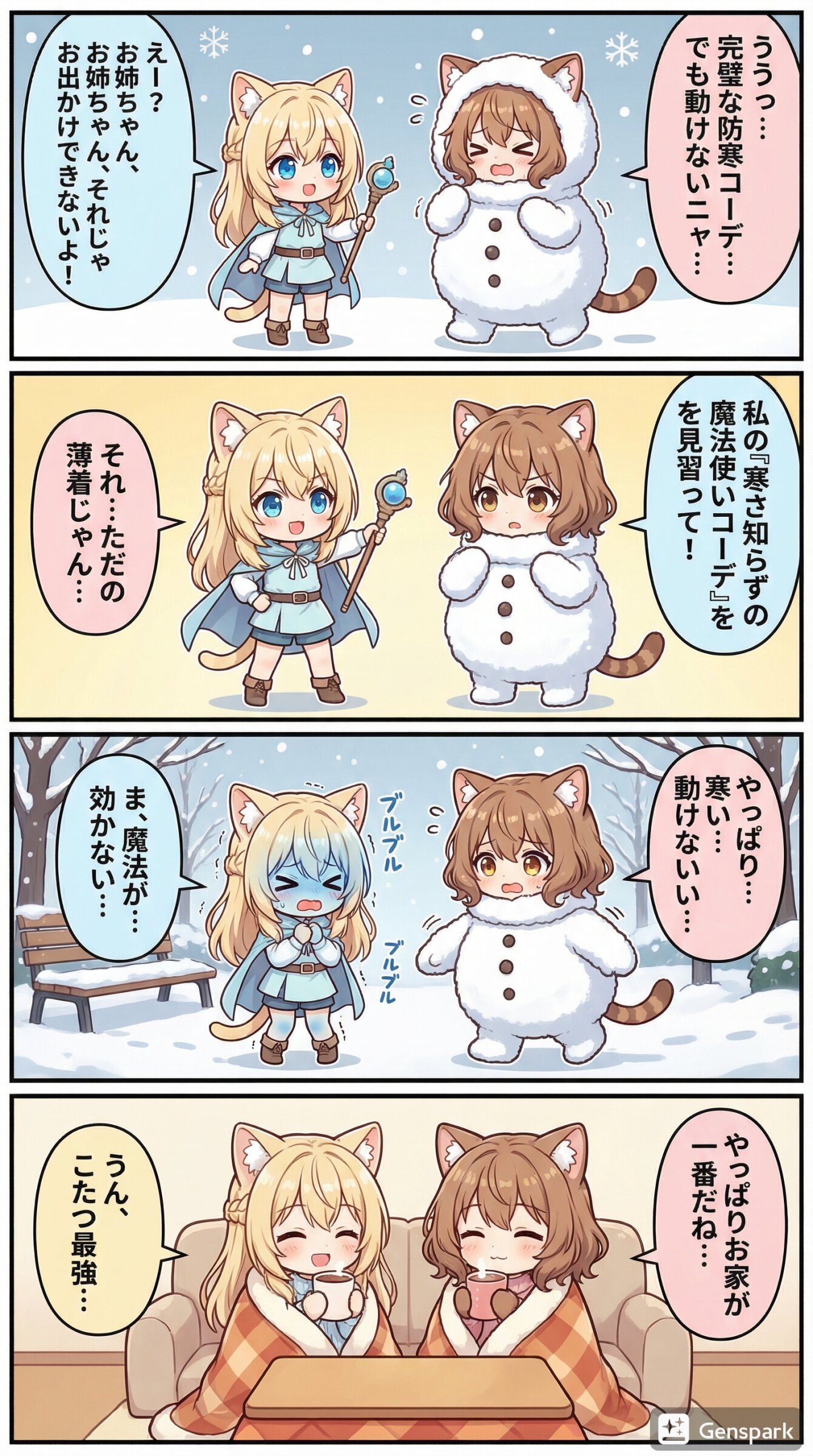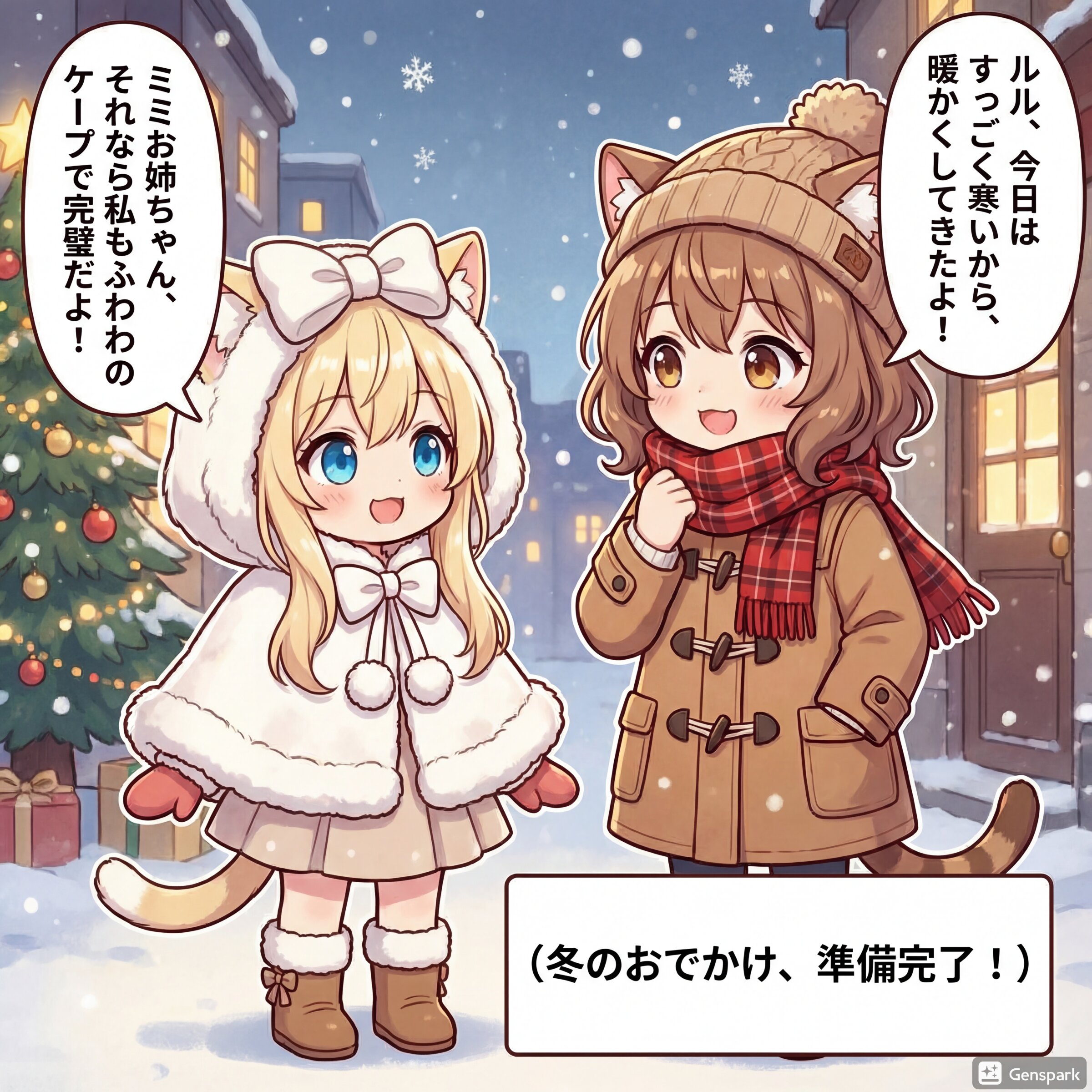 「冬のおでかけコーデ」をテーマに、茶髪猫耳娘(姉)の「ミミ」と金髪猫耳娘(妹)の「ルル」が登場するユニークな短編漫画を作って。セリフはすべて日本語。右から左へ読むことを前提としたセリフ配置。キャラの服はネタに合うものに着替えさせて。