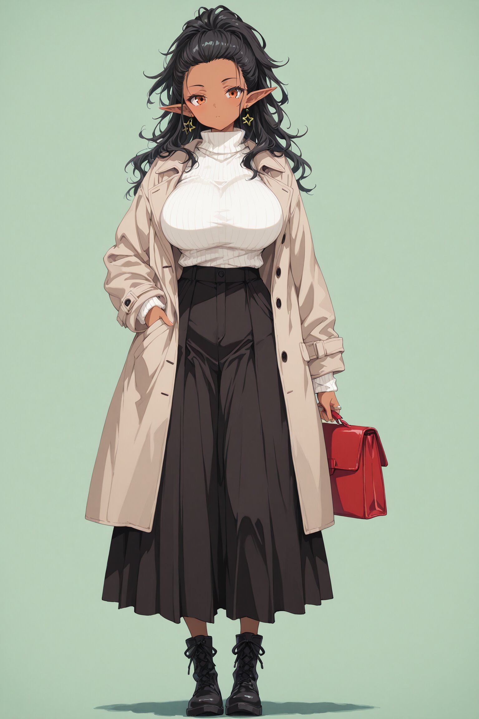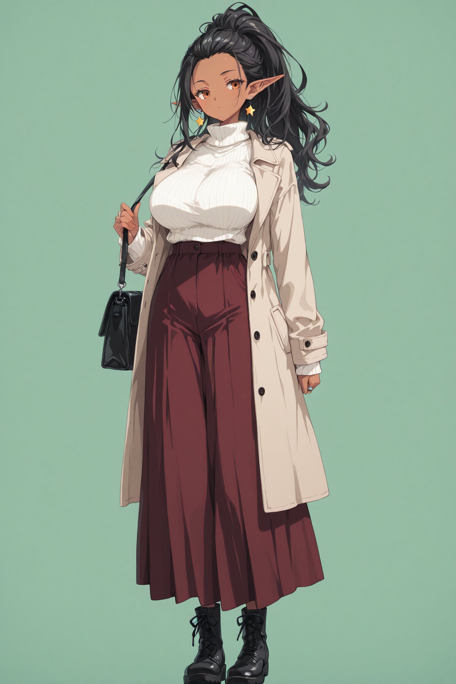 (1girl) BREAK ,BREAK, Elf, Adult, voluptuous body, ponytail, hair pulled back BREAK, black hair, long hair, sharp bangs, ((dark skin:1.2)), BREAK, narrow eyes, (orange eyes) huge breasts, large breasts, soft breasts, (muscular, toned body, athletic build) star earrings, ring earrings duffle coat, high-neck sweater, turtleneck, long skirt, short boots holding a bag BREAK, (((No background: 1.3)))Green background (Full body shot:1.3), BREAK, (newest, anime, animation, anime screen capture, anime style:1.3) BREAK, (masterpiece, , vibrant, very aesthetic, highly detailed, best quality, 16k:1.3) perfect fingers,