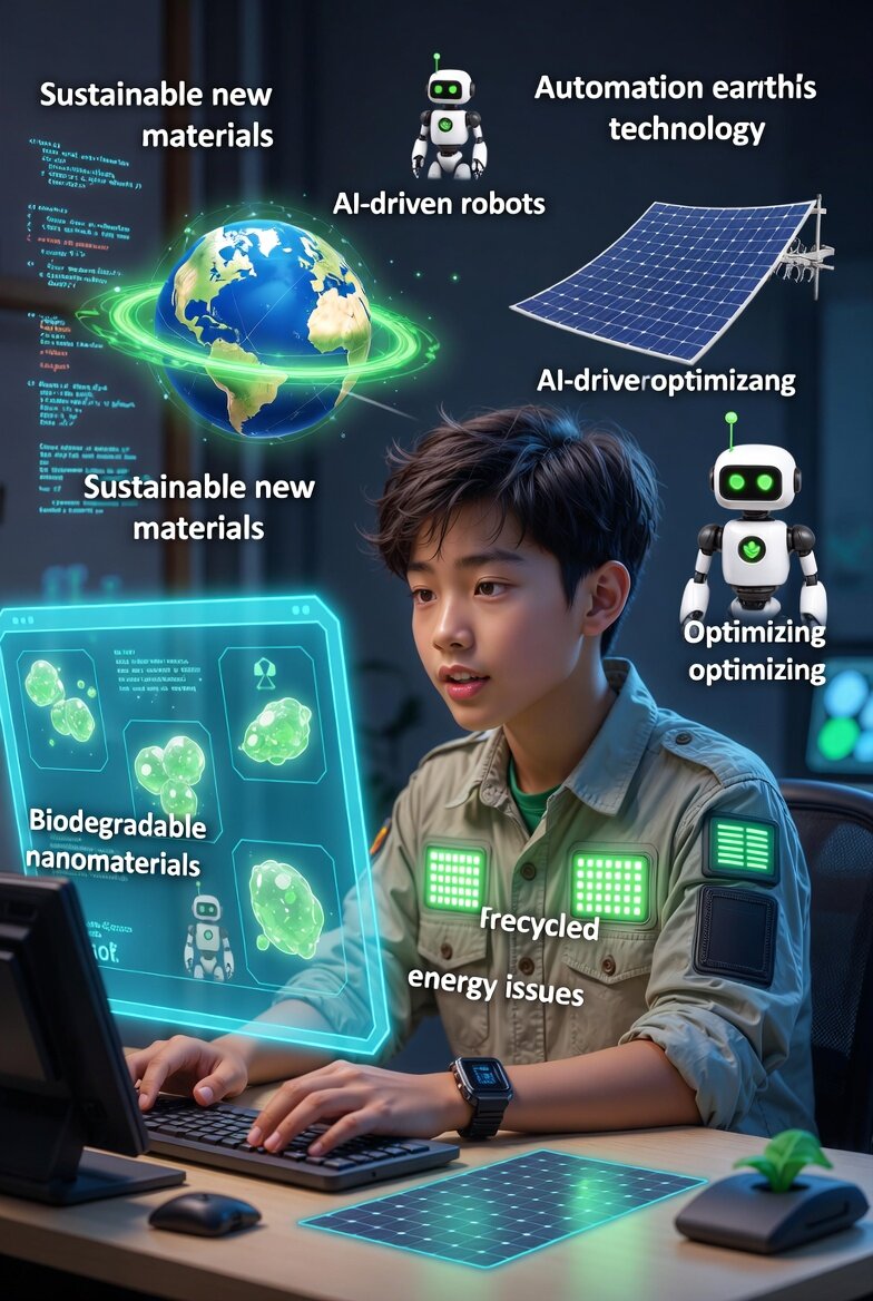 20代前半の好奇心旺盛な若者が、ショートヘアでエコフレンドリーな服(リサイクル素材のシャツにLEDパッチとスマートウォッチ)を着て、2026年の未来的なホームラボのデスクに座っているデジタルアートイラスト。地球環境やエネルギー問題に貢献する持続可能な新素材と自動化技術をワクワクしながら学んでおり、ホログラムディスプレイで生分解性ナノ素材の輝く緑の粒子や、AI駆動のロボットが太陽エネルギーシステムを最適化する様子を表示している。モチーフとして、浮遊する地球儀を緑のエネルギーリングで囲み、柔軟なソーラーシート、小さなエコロボット、背景にコードアルゴリズムを配置。ネオンブルーとグリーンの照明で近未来的な雰囲気を強調し、持続可能な世界への希望とイノベーションを表現。スタイル: 詳細なデジタルアート、高解像度、インスピレーショナルでポジティブな雰囲気。