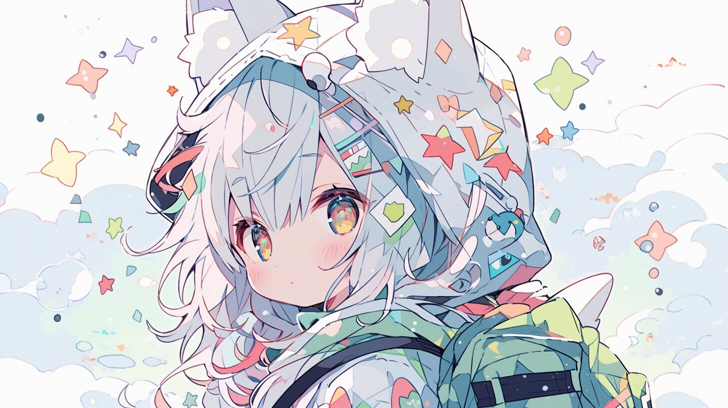 ふわふわの雲の上を駆け抜ける白髪の少女。星やハートのステッカーが輝くフードをかぶり、緑のバックパックを背負って、未知の冒険へ出発する。彼女の瞳には、無限の空と夢が映り、風に舞うカラフルな粒子が物語を紡ぐ。もしかすると、彼女は失われた星を探す旅人なのか、それとも日常を抜け出した夢想家? あなたも一緒に、星空の彼方へ飛び立ってみませんか?