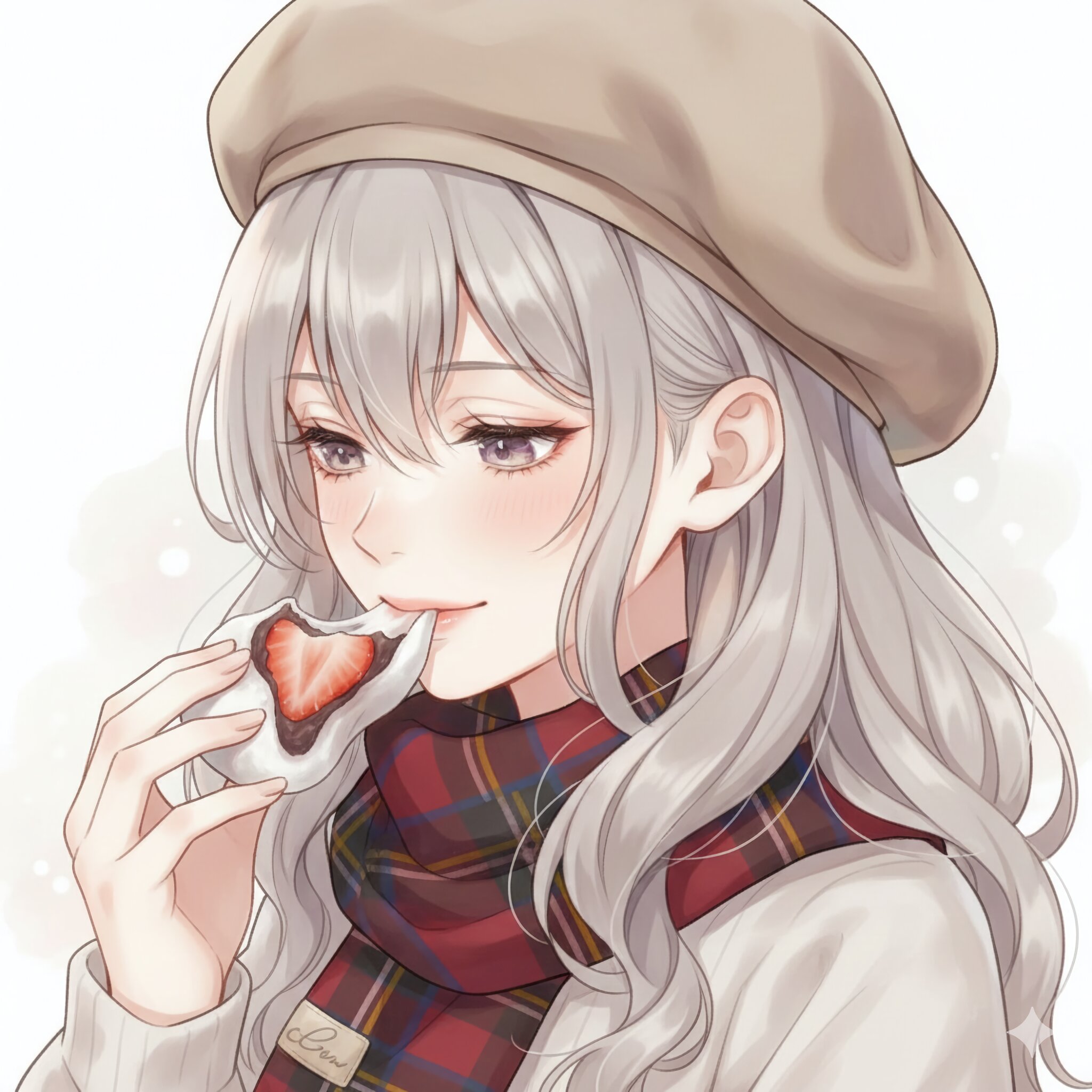 キャラは用意しています。女性の年齢は若年成人。 女性がいちご大福を食べようとする少し斜め俯瞰の構図。 高精細。アニメ風。 **極度に繊細な線画,細い線****柔らかな陰影,非常に綿密な,複雑なディティール****淡い水彩,透明感のある水彩,柔らかな水彩**(masterpiece,best quality:1.4)、高解像度。 クローズアップのポートレート。超ドアップの表情ショット。 サブサーフェススキャタリング、柔らかな光、自然光。 (女性の特徴) 下まつげが綺麗。 優美で、穏やかな、静謐。 モデルのような透明感のある美人。 美しい女性。聖母のような優しい表情。 目は細めている。 shiny skin. 横顔。 はにかみ笑顔。 目線はいちご大福へ。 いちご大福を片手で持ち、噛んで大福が伸びているシチュエーション。 シンプルな背景、白い背景、かすかな色、柔らかくぼかされた背景、ボケ効果。 ボリュメトリックライティング。