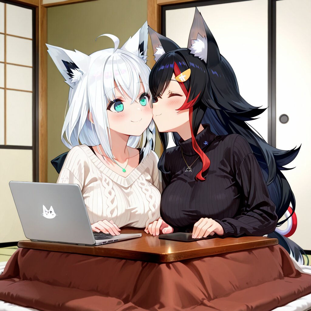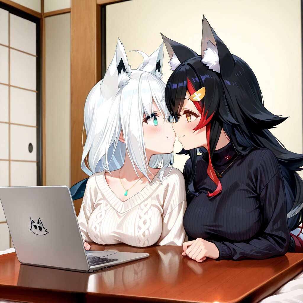 multiple girl, 2girl, /<lora:ookami mio:0.4>ookami mio, large breasts, black turtleneck sweater, very simple necklace, /,<lora:sirakami_fubuki:0.4>sirakami fubuki, light white shoulder sweater, to point with a finger laptop pc, / room, Japanese kotatu, kotatu table, girls in kotatu, kotatu futon, in kotatu futon, (((sit down girls))), (((gaze at each other))), (((face-to-face girls))), cheek-to-cheek girls, side-by-side, bust shot, blush, smile, close mouth, elegant girl, 1laptop pc on table, looking at laptop pc, high quality, / kiss, hands overlapping,