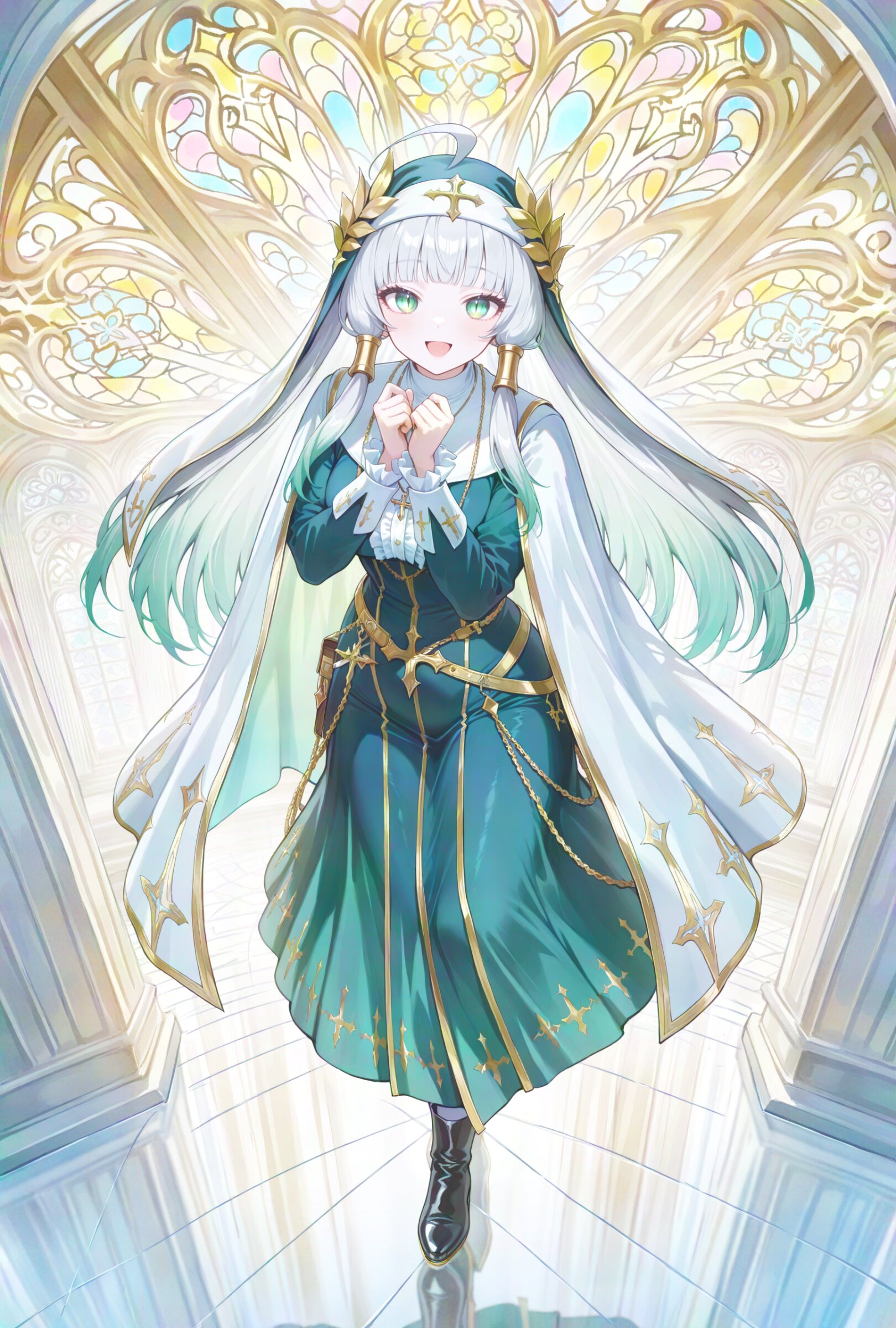 straight-on (portrait:1.0) (high angle shot:1.2) dynamic angle, looking at viewer, 1girl, priest, beautiful detailed eyes, holy face, cool Elegant and sophisticated demeanor, (pale skin:1.0), skindentation, beautiful dark green eyes, slit pupils , silver hair, dimgray colored tips, shoulder length hair, straight hair blunt bangs ahoge hair tubes, first-rate female bodies perfect body beautiful medium breasts smart hips, (divine,Holy,goddess:1.0),, nun,Gold hair ornaments, silver cape, cloak, black pious Coat, long sleeves, , , , center frills , ,, long skirt, (silk overskirt:1.0), boots, ecstatic expression, jubilant, overjoyed, exuberant, (smile a lot:1.0), God Light, (intricate), opulent, lustrous, holy outfit, A solemn atmosphere of piety, ascetic manner, indoor, Saint Patrick's Cathedral, , stained glass, book, holy light, beautiful morning, divine energy aura, blowing kiss super fine concept art, hard surface, graceful eyes, reflection, masterpiece, best quality, amazing quality, very aesthetic, absurdres you can add scenery, (volumetric lighting), To make the background more distinctive. professional art lots of details, , overexposure, shiny-glistening, (watercolor style:1.2), (pastel color style:1.2) <lora:noline (1):-0.5> <lora:sdxl2-flat2-512b:0.0> <lora:facelightup_xl_v10:0.5>
