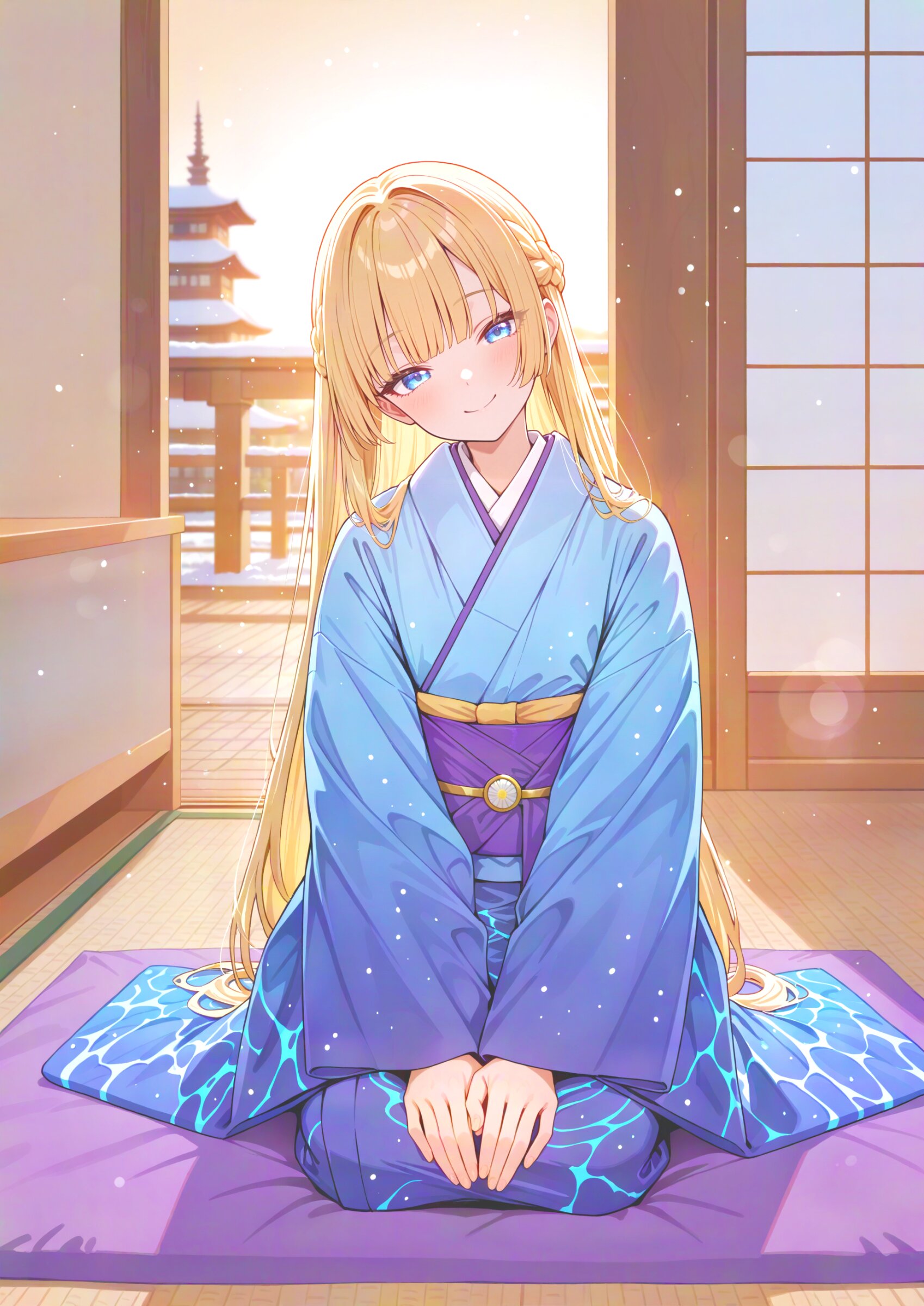 foreshortening, feet out of frame (flat chest, 1girl (13yo:1.1), very long hair, french braid, straight hair, hime cut, blond hair, blue eyes, closed mouth smile, happy smile, head tilt, smile:1.0), winter atmosphere, new year theme, from outside, window, condensation, windowsill, Gradient walls, slim shelf, brown kilim rug, japanese architecture, tatami, seiza, zabuton, japanese clothes, blue layered kimono ,tabi, winter out of window, , , depth of field, bokeh, caustics, afternoon, super fine concept art, hard surface, 8K, unreal engine, masterpiece, best quality, amazing quality, very aesthetic, absurdres, you can add scenery, (volumetric lighting), To make the background more distinctive. professional art lots of details, , overexposure, shiny-glistening, (watercolor style:0.0), (pastel color style:0.0) 4ur4_illu,shiny, glowing, glowing particles, glowing light particles, light particles, , <lora:noline (1):-0.5> <lora:sdxl2-flat2-512b:0.15> <lora:facelightup_xl_v10:0.5> <lora:V2_yakumo_alchemy:0.2> <lora:Aura_illu:0.1>
