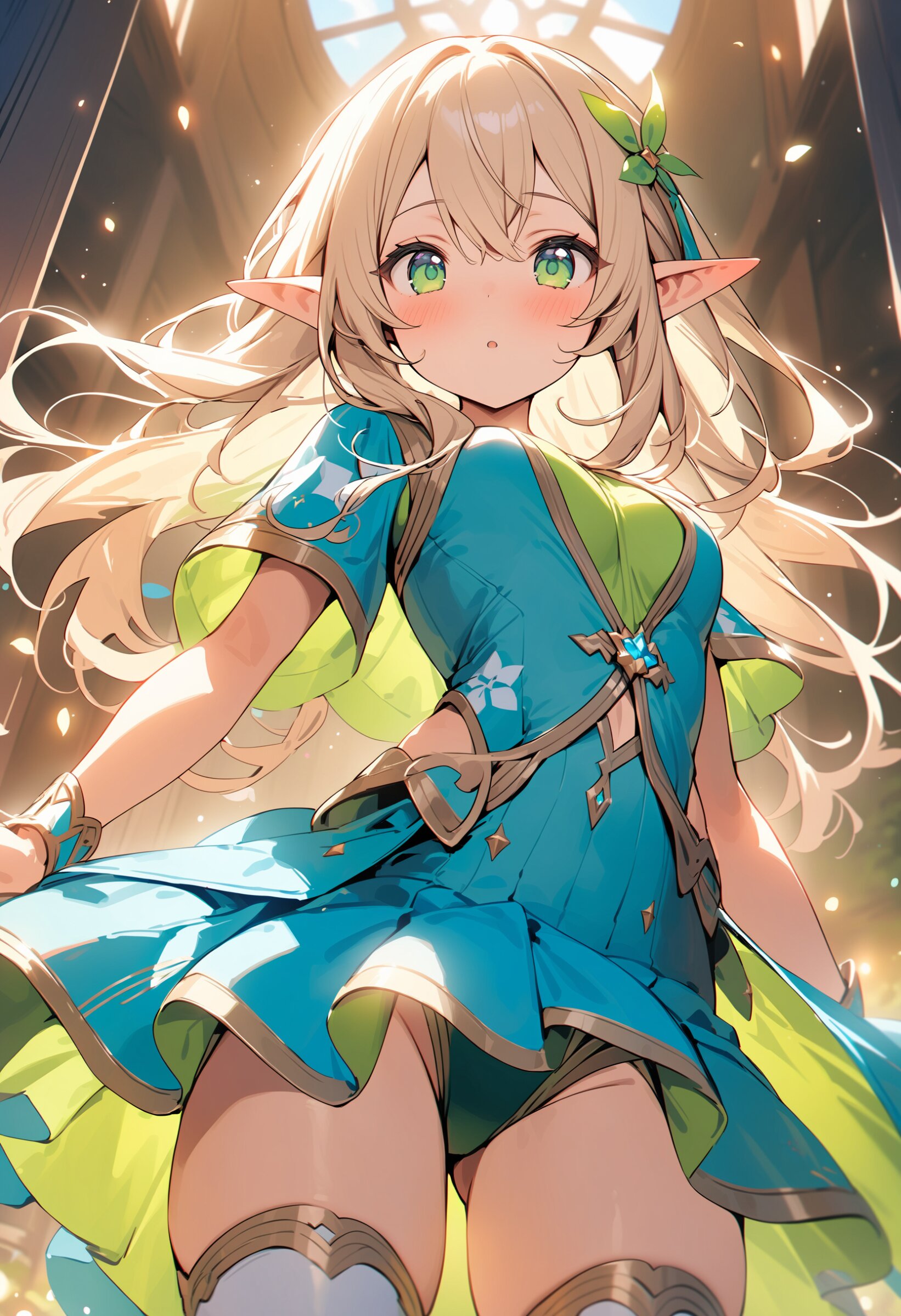 ((masterpiece)), ((best quality)), ((kawaii)), cute, (lovely), ((extremely detailed)), (beautiful), dynamic angle, a cute girl, 1girl, solo, ((elf)),beautiful blond hair, beautiful green eyes, ((beautiful eyes)), long hair, fantasy clothes,