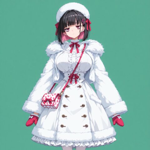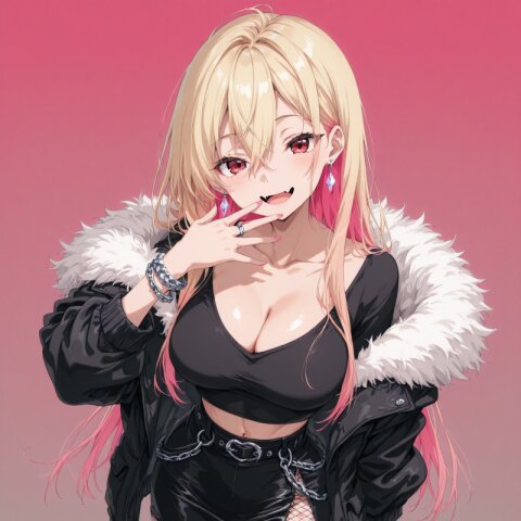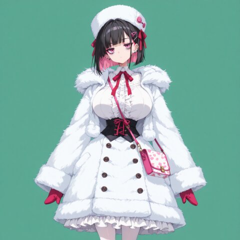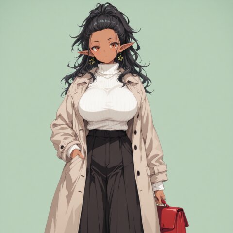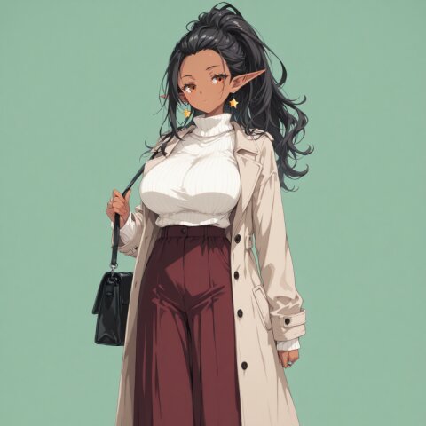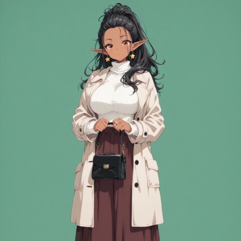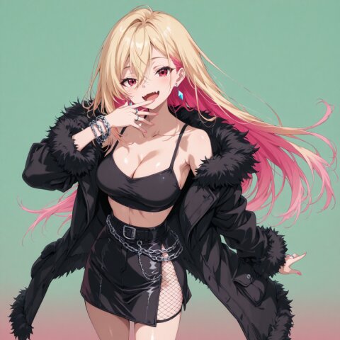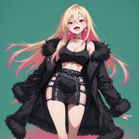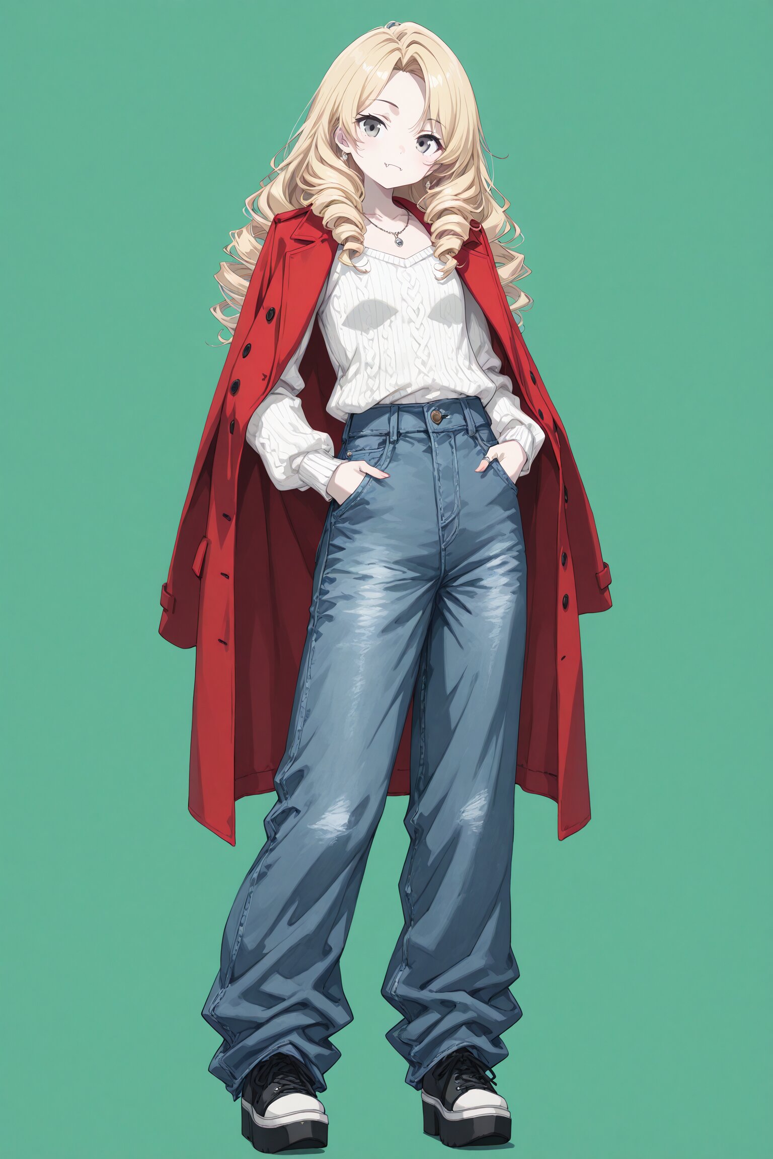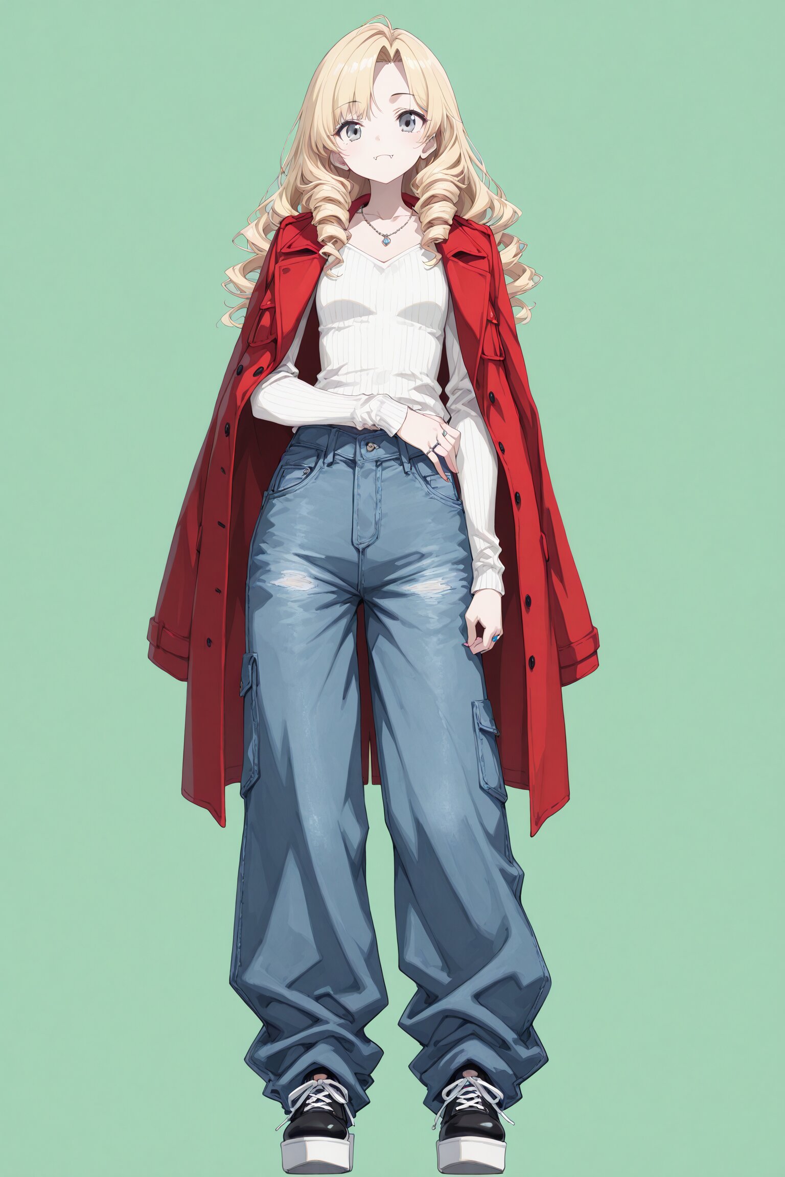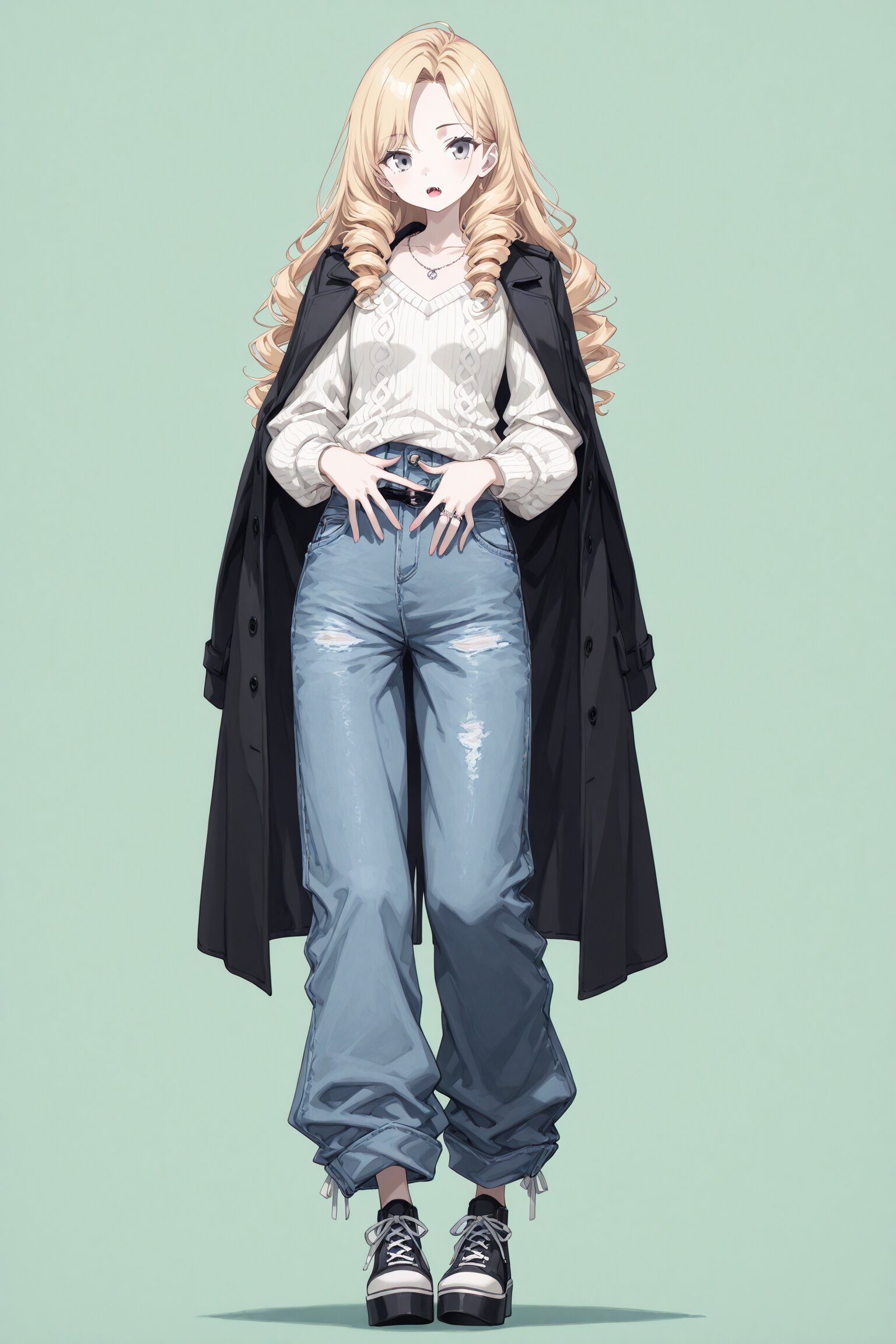 (1girl), young female, BREAK, Blonde, long hair, (drill hair), (left-parted bangs:1.4),, silver eyes, pale skin, long fangs, flat chest, small breasts, gorgeous, elegant, ring, necklace Sweaters, layering, tube tops, coats on shoulders, overcoats Baggy pants, denim pants, platform shoes BREAK, (((No background: 1.3)))Green background (Full body shot:1.3), BREAK, (newest, anime, animation, anime screen capture, anime style:1.3) BREAK, (masterpiece, , vibrant, very aesthetic, highly detailed, best quality, 16k:1.3) perfect fingers,