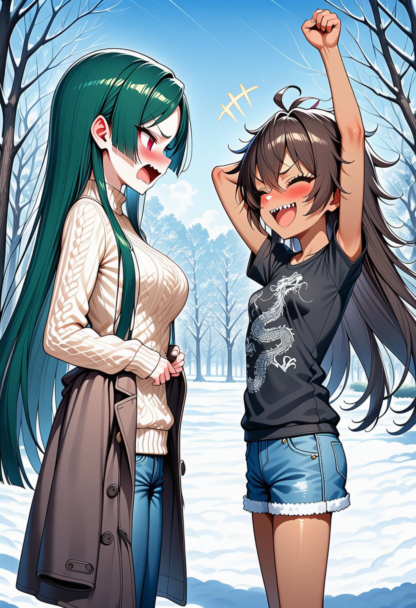 ai-generated, year 2024, anime style, 2girl, yuri, 1.5::facing opposit each other::, midday, winter, outdoor, in modern park, from side, masterpiece, best quality, ultra detailed, perfect fingers, high resolution, absurdres, perfect anotomy, detailed background, unity 8k wallpaper, very aesthetic, masterpiece, no text