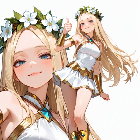 A 17-year-old girl with light blue, wavy long hair and sky blue (large eyes:1.2) stands in a luxurious ballroom, wearing a (green luxurious Prince costume:1.5) with long sleeves, a (White luxurious Cape:1.4), and a (luxurious Green mini skirt with white frill:1.3). She has a (luxurious crown on head:1.3) and (luxurious White gloves:1.2), with a (dagger on waist:1.3) and (White luxurious boots:1.3) over white tights. Her round, childlike face is blushing, with drooping eyes and a happy smile as she holds a (holding a bouquet in hand:1.5). She has a small, thin build with thin legs, and her detailed skin, hair, and clothes are rendered in a masterpiece-quality style. The scene is set in a palace ballroom with Rococo architecture, (surrounded by friends:1.8), with lots of flowers, soft lighting, and a dreamy, romantic academia atmosphere. The heartwarming birthday celebration has a light, cozy, and romantic ambiance, with a bloom effect enhancing the dreamy quality of the image.
