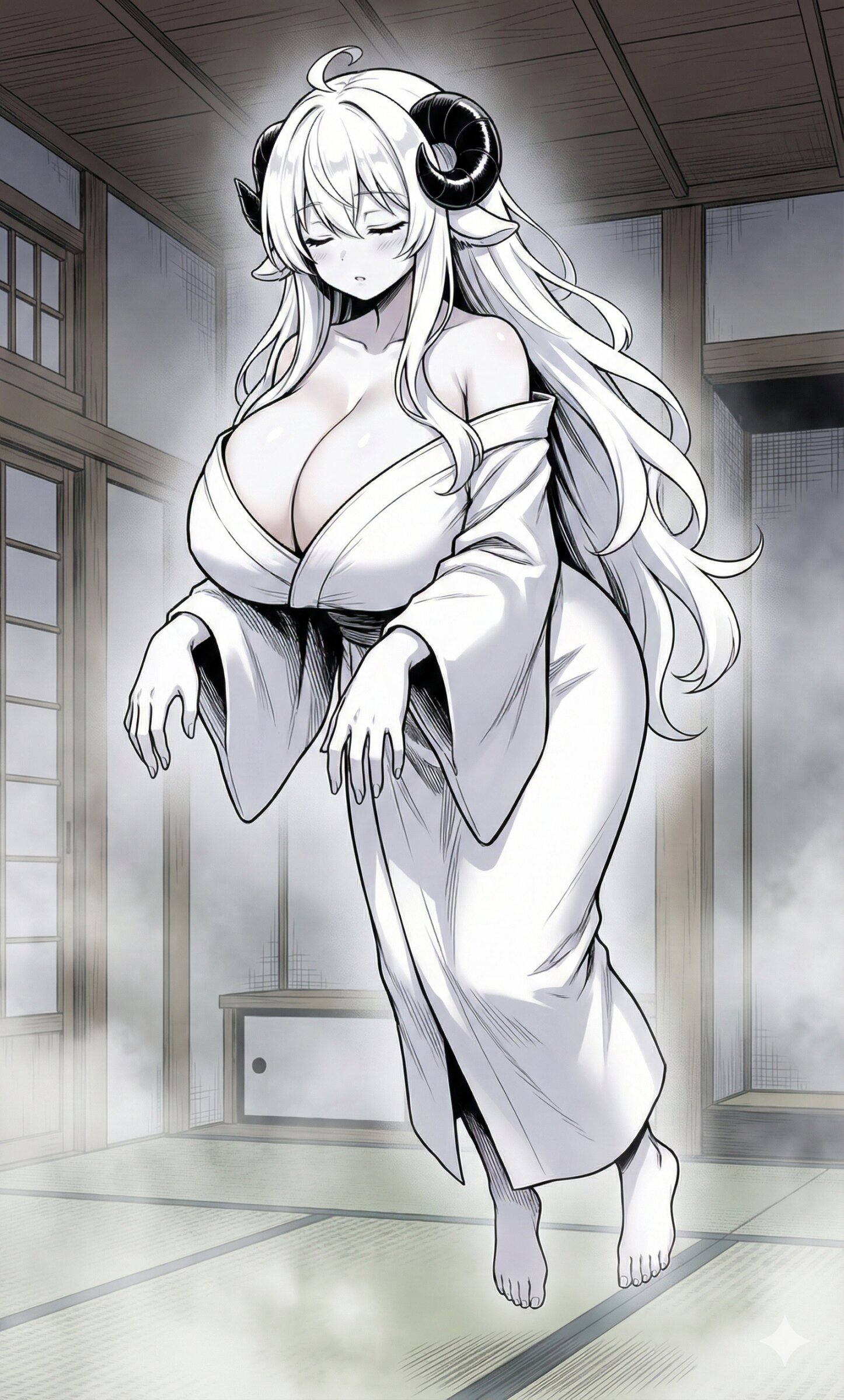 イラストのキャラクターをGペンでペン入れする。2D。カラー。背景に濃いスクリーントーンを貼っている。強めの陰影とコントラスト。線は細く薄くする。バストとヒップがとても豊満。キャラクターの特徴をそのままに、構図とポーズを変更する。キャラクターを下から見る。キャラクターは空中に浮いている。キャラクターは目を閉じて眠り、白い着物を着ている。肩をはだけさせている。背景は霧に包まれた旅館の一室で、裸足で浮いている。眠気の泡を出している。肩に掛けられた鞄を削除。両手を幽霊の様な姿勢で垂れ下げて前に出す。キャラクターの羊角は黒、髪色は純白、瞳は銀色、肌は白。一人称視点はベッドの中からキャラクターを見ている。陰影はペン書き。完全に新しいイラスト。グラデーションを追加。 ▶︎頭頂部に短いアホ毛を追加。バストサイズを更に大きくする。 ▶︎「ゆらァ~~~」という浮遊の効果音を薄く流れる様に、パースを利かせて書く。