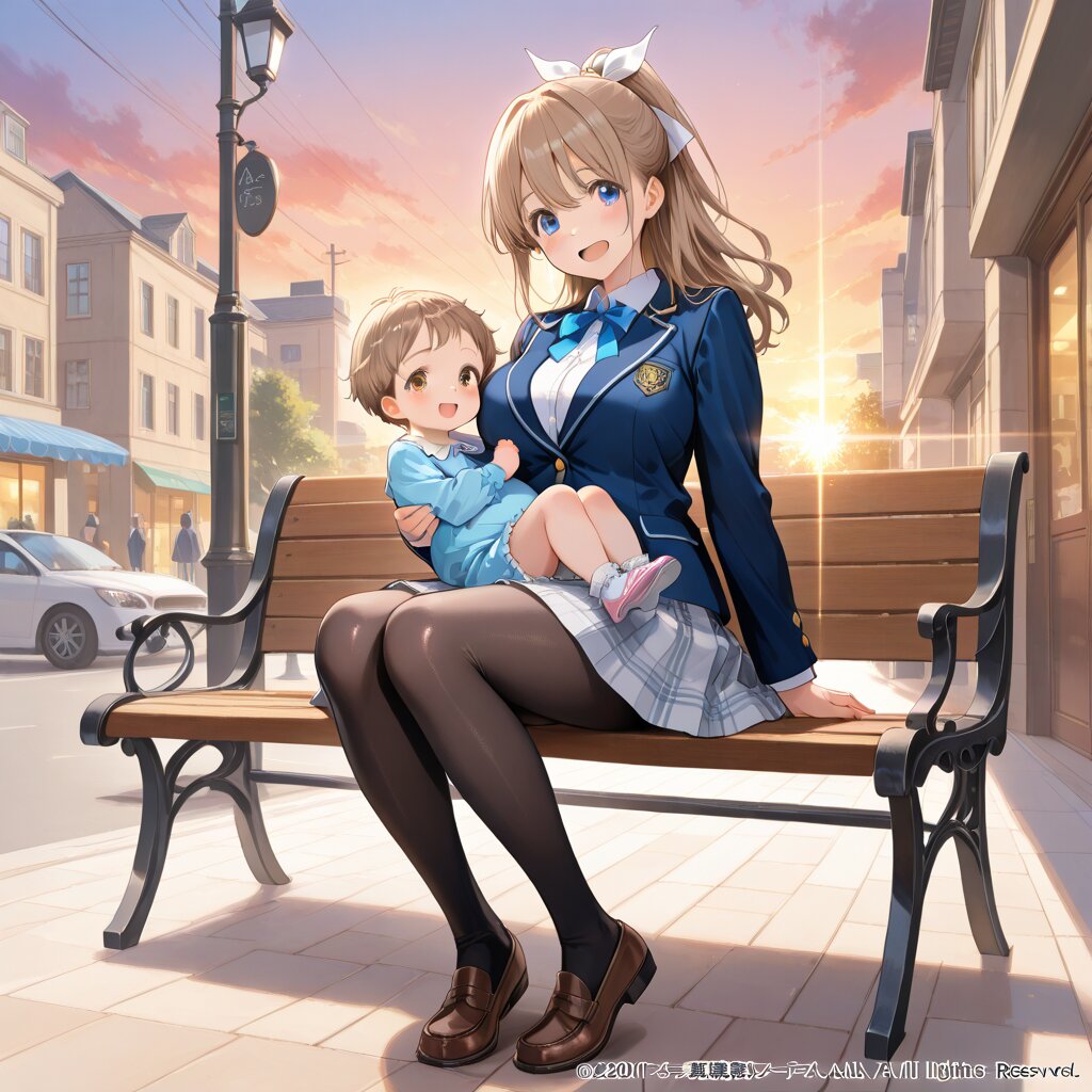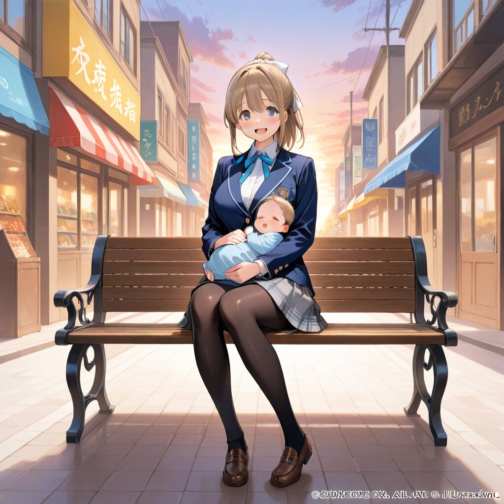 A girl with long, light brown hair tied into a ponytail with a white ribbon, brown eyes, school uniform, jumper skirt, blouse, blue ribbon tie, blazer, black tights, large breasts, curvaceous figure, height 160cm, 16 years old, high school girl, Evening shopping street, sitting on a bench within the shopping street holding a baby, gentle smile,1baby, baby carry, Art style is anime-inspired,three-quarter view, sunset light, masterpiece, top quality, highly aesthetic, absolute resolution, ultra-detailed, perfect composition,striking. (masterpiece,high resolusion,illustration,ultra detailed 8k art,extremely detailed CG,official art,clothes reflecting light,detailed shiny skin,detailed background:1.3), ((highly detailed beautiful face and eyes)),1girl,beautiful blonde hair,beautiful blue eyes,open mouth,looking at viewer,idol costume,(fullbody shot:1.4),