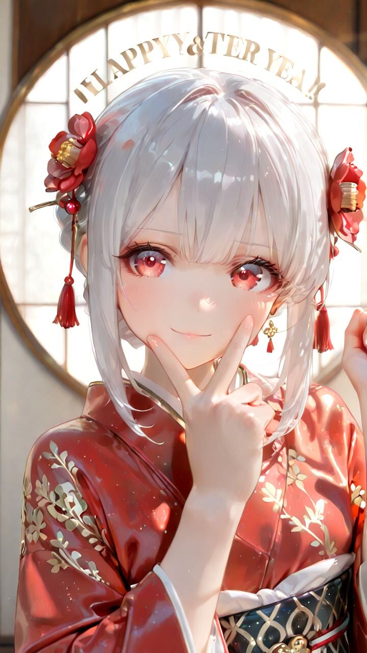 nengajo japanese new year postcard, energetic electro swing anime girl, long silver hair, big bright smile, playful wink, wearing a dance-friendly furisode kimono (kimono style), high-waist obi belt (subtle emphasis), sleeves tied up with tasuki cord for movement, short hakama-style layered skirt under the kimono for dynamic motion, kimono fabric pattern: seigaiha waves + ume blossoms in gold embroidery, red and white mizuhiki ribbon bow at the obi, zori sandals, performing a charleston kick pose (one leg forward, toes pointed), arms swinging outward, dynamic motion lines, dutch angle composition, background: simple off-white washi paper texture, minimal art deco frame, small icons of kadomatsu and kagami mochi in corners, large blank space at top left for greeting text, warm golden lighting, crisp lineart, highly detailed textile texture, 8k, masterpiece