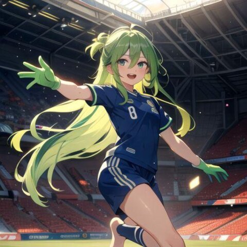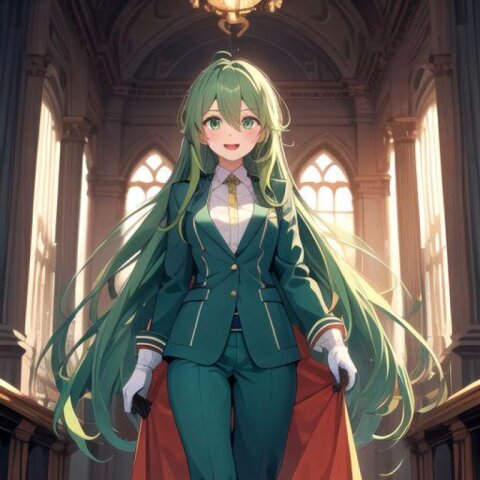 green hair, very long hair, green eyes, gloves, barefoot, (long toes:1.3), (long jeans:1.4),(coat:1.3),smile,open mouth, forest background