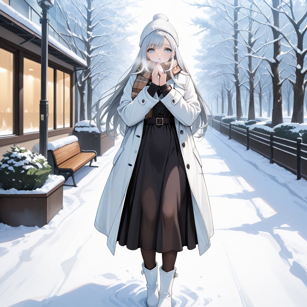 1girl, silver hair, long hair, translucent light blue eyes, large chest, white knit hat, black long knit dress, white boots, white down coat, brown tartan check scarf, rubbing cold hands together, exhaling breath, snowy winter street, masterpiece, ultra detailed