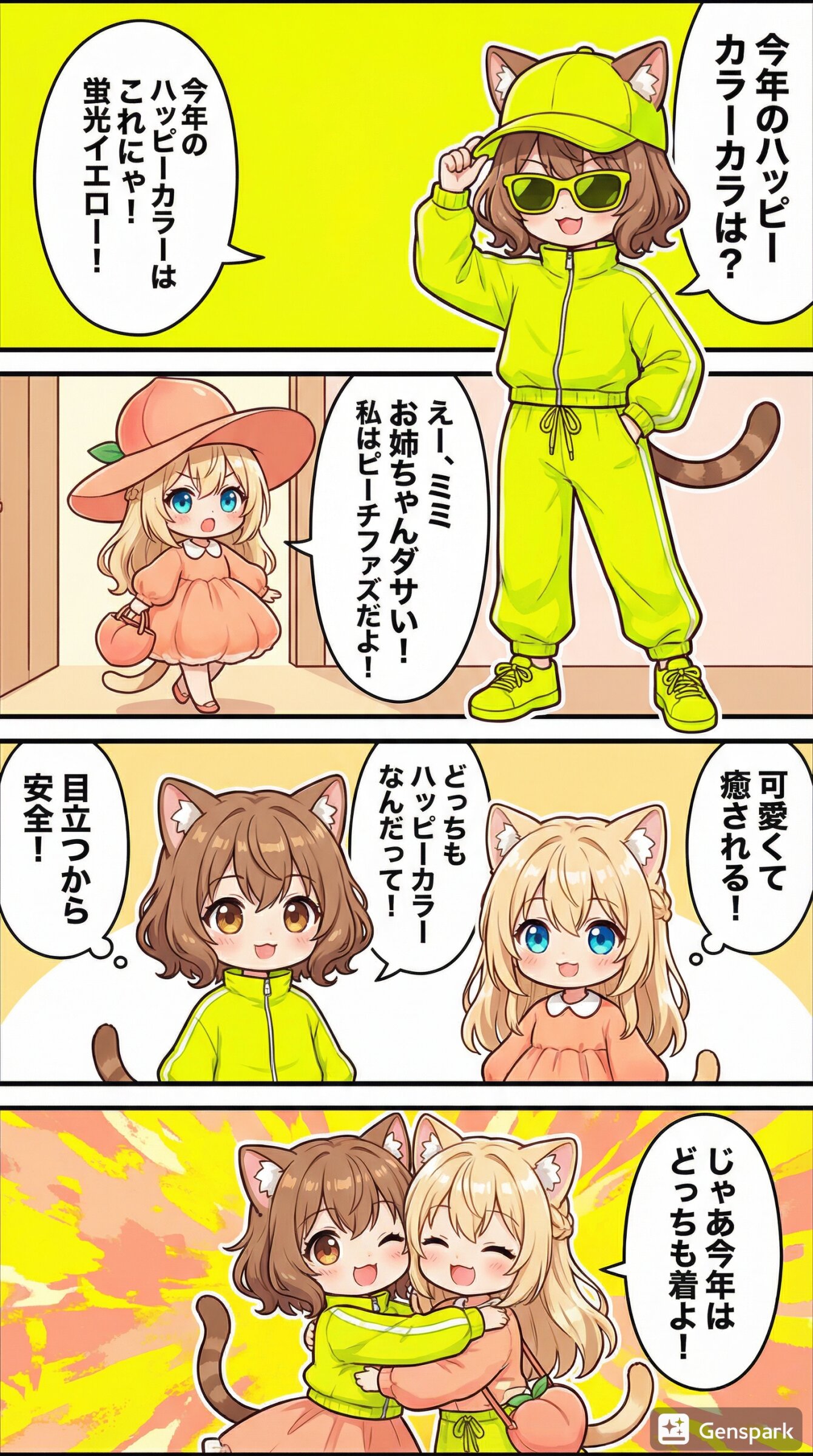 「今年のハッピーカラー」をテーマに、茶髪猫耳娘(姉)の「ミミ」と金髪猫耳娘(妹)の「ルル」が登場するユニークな短編漫画を作って。セリフはすべて日本語。右から左へ読むことを前提としたセリフ配置。キャラの服はネタに合うものに着替えさせて。