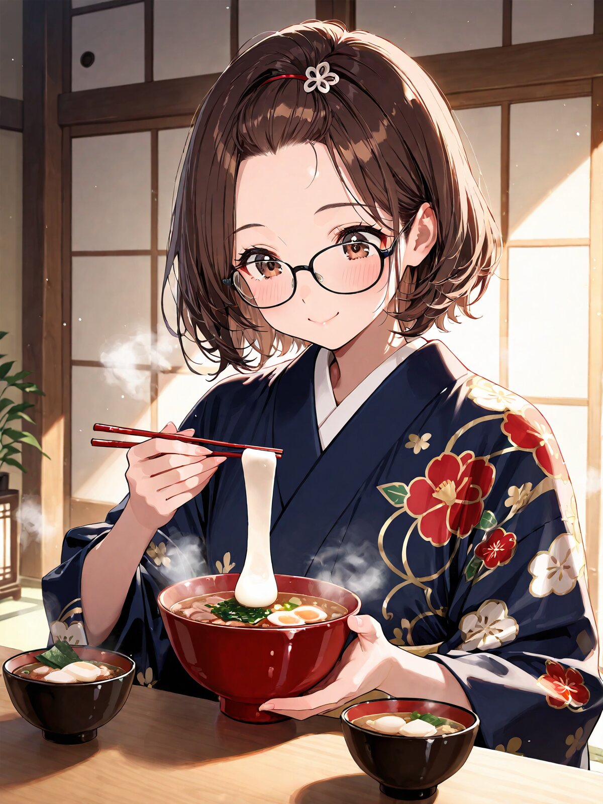 woman, forehead, glasses, brown hair, brown eyes, short hair, eating ozoni soup, traditional New Year's mochi soup in a red bowl with mochi cakes, vegetables, and clear broth, holding chopsticks, happy expression, wearing kimono, steam rising from the hot soup, cozy Japanese room background, festive atmosphere,