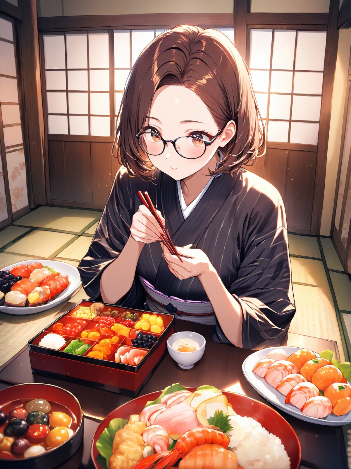 woman, forehead, glasses, brown hair, brown eyes, short hair, eating osechi ryori, traditional Japanese New Year's food in square jubako boxes with kuromame black beans, kamaboko fish cake, datemaki omelette, kuri kinton, shrimp, chopsticks in hand, wearing kimono, cozy tatami room