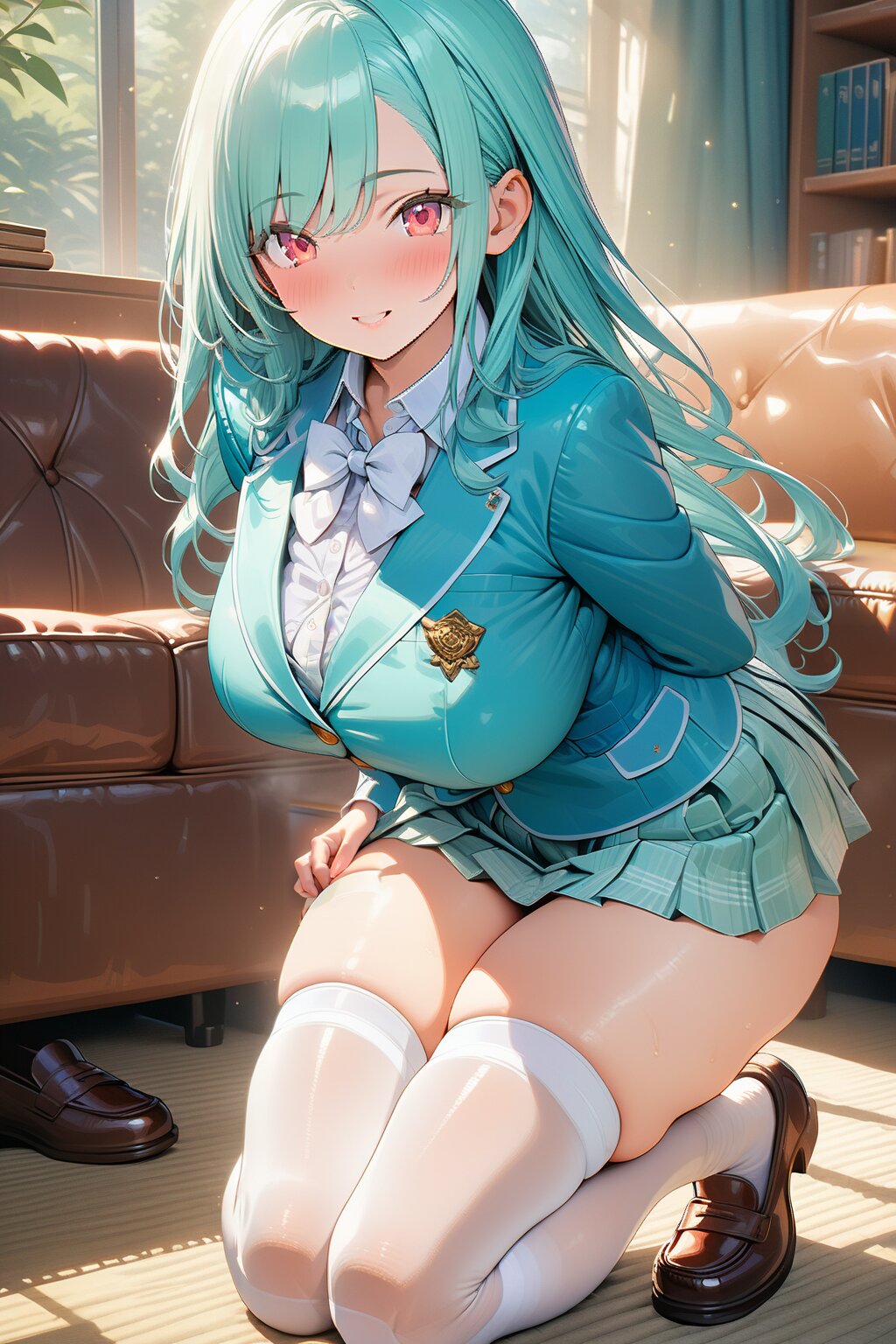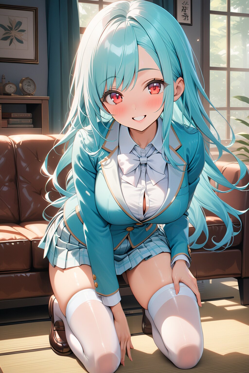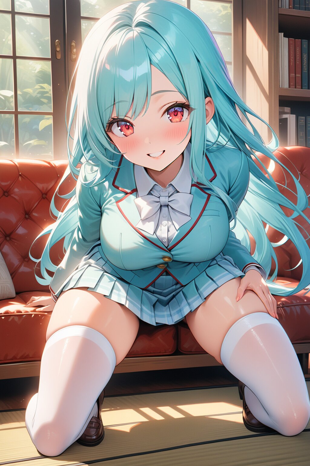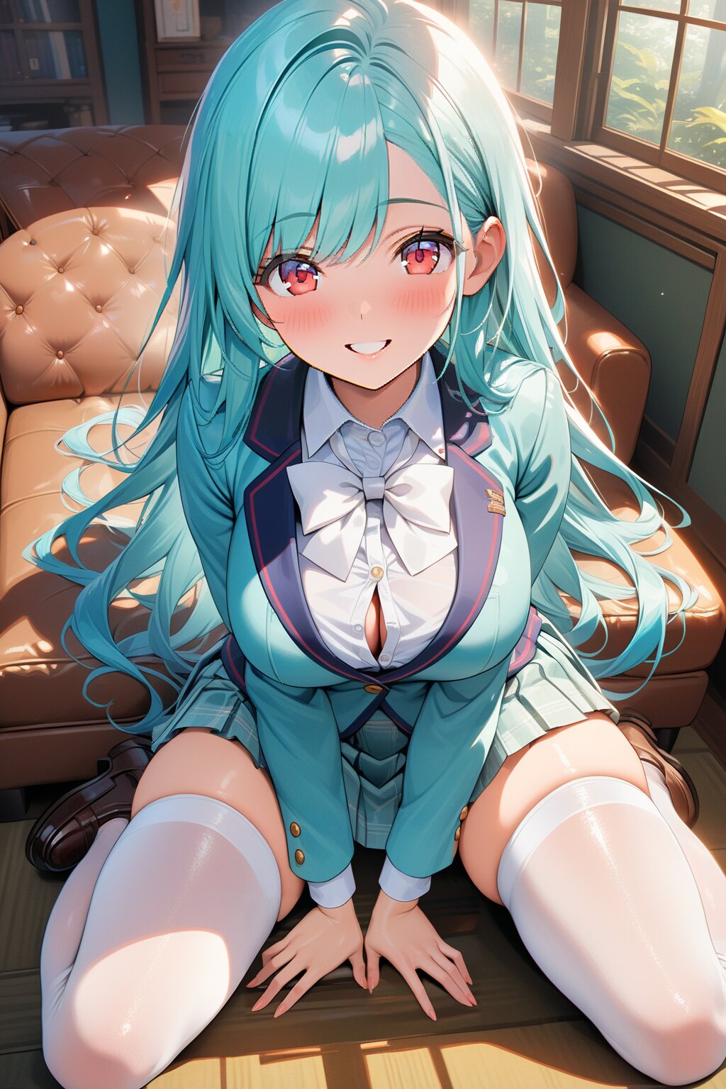 (full body:1.4),1girl, solo, (japanese girl:1.3), focus on character, looking at viewer, (kneeling:1.3), (on knees:1.2), (legs apart:1.3), (leaning forward:1.1), (hand on thigh:1.3), (indoors:1.1), (beige leather sofa:1.2), tufted sofa, sunlight, (window light:1.1), dramatic shadows, depth of field, ray tracing, cinematic lighting, detailed background, (light aqua long hair:1.5), (straight long hair:1.4), (asymmetrical bangs:1.2), (red eyes:1.2), (large breasts:1.3), (gleaming skin:1.4), (smile:1.3), blush, BREAK (school uniform:1.2), (light aqua blazer:1.3), (white trim:1.2), long sleeves, (white shirt:1.3), (collared shirt:1.2), (buttoned shirt:1.3), (white bowtie:1.2), ribbon, (light aqua skirt:1.2), (miniskirt:1.2), (white thighhighs:1.2), (sheer thighhighs:1.1), (shiny texture:1.1), brown loafers, shoes, ((8k, masterpiece, best quality, ultra-detailed)), game cg, masterpiece, (perfect face:1.1025), (perfect hands:1.1025), (perfect legs:1.1025), (perfect arms:1.1025), (perfect fingers:1.1025), <lora:xl_more_art-full_v1:0.6> <lora:add-detail-xl:1>,