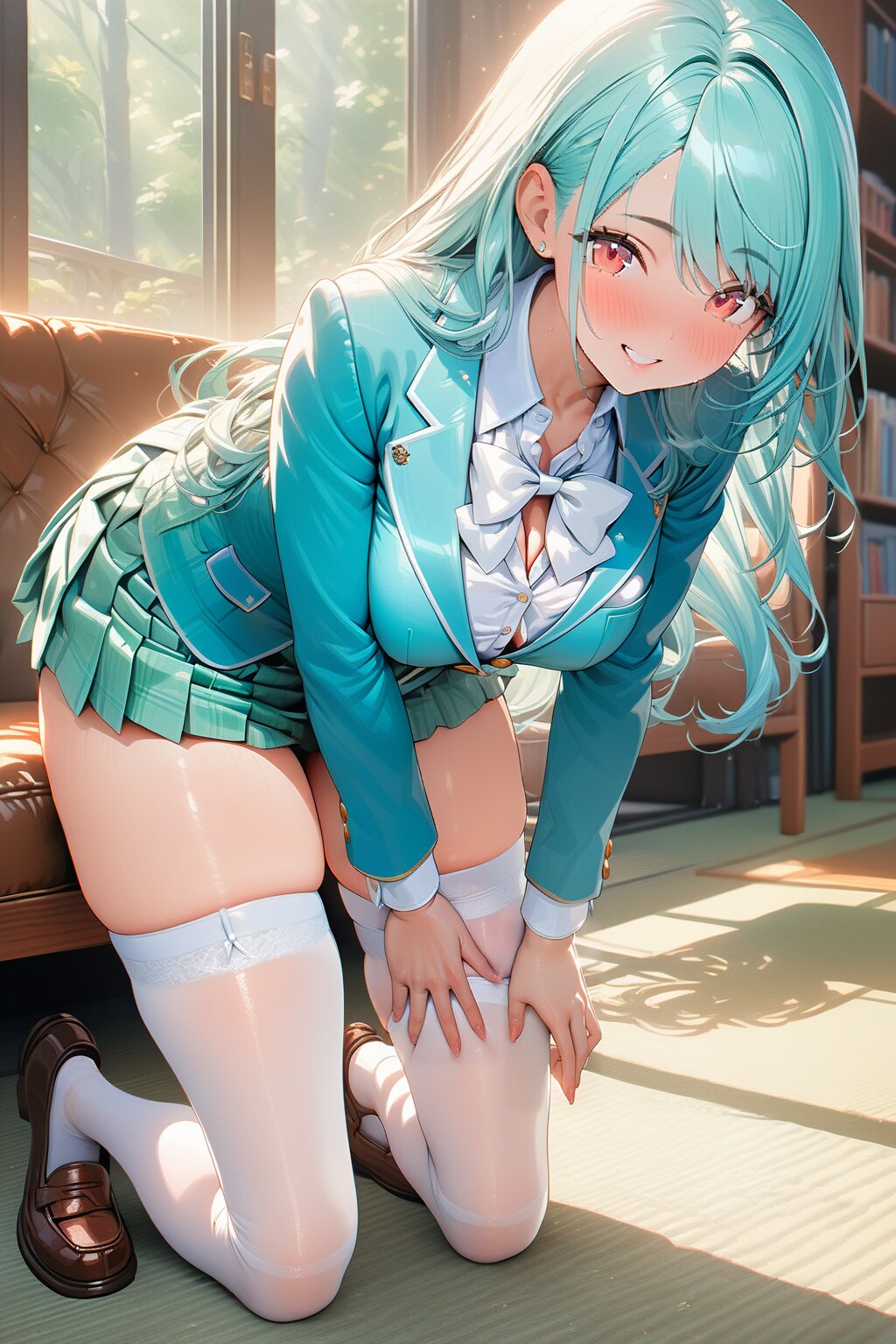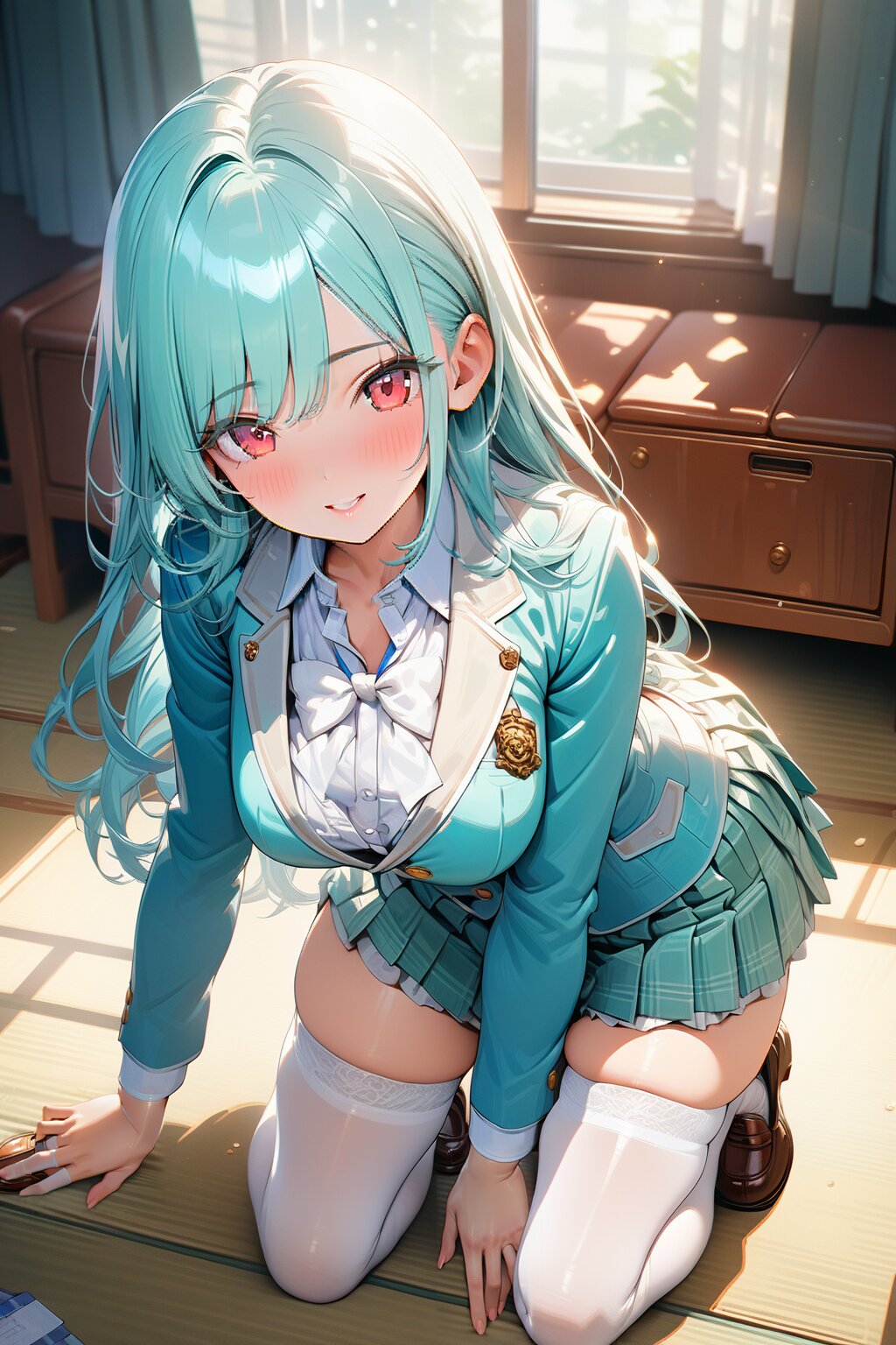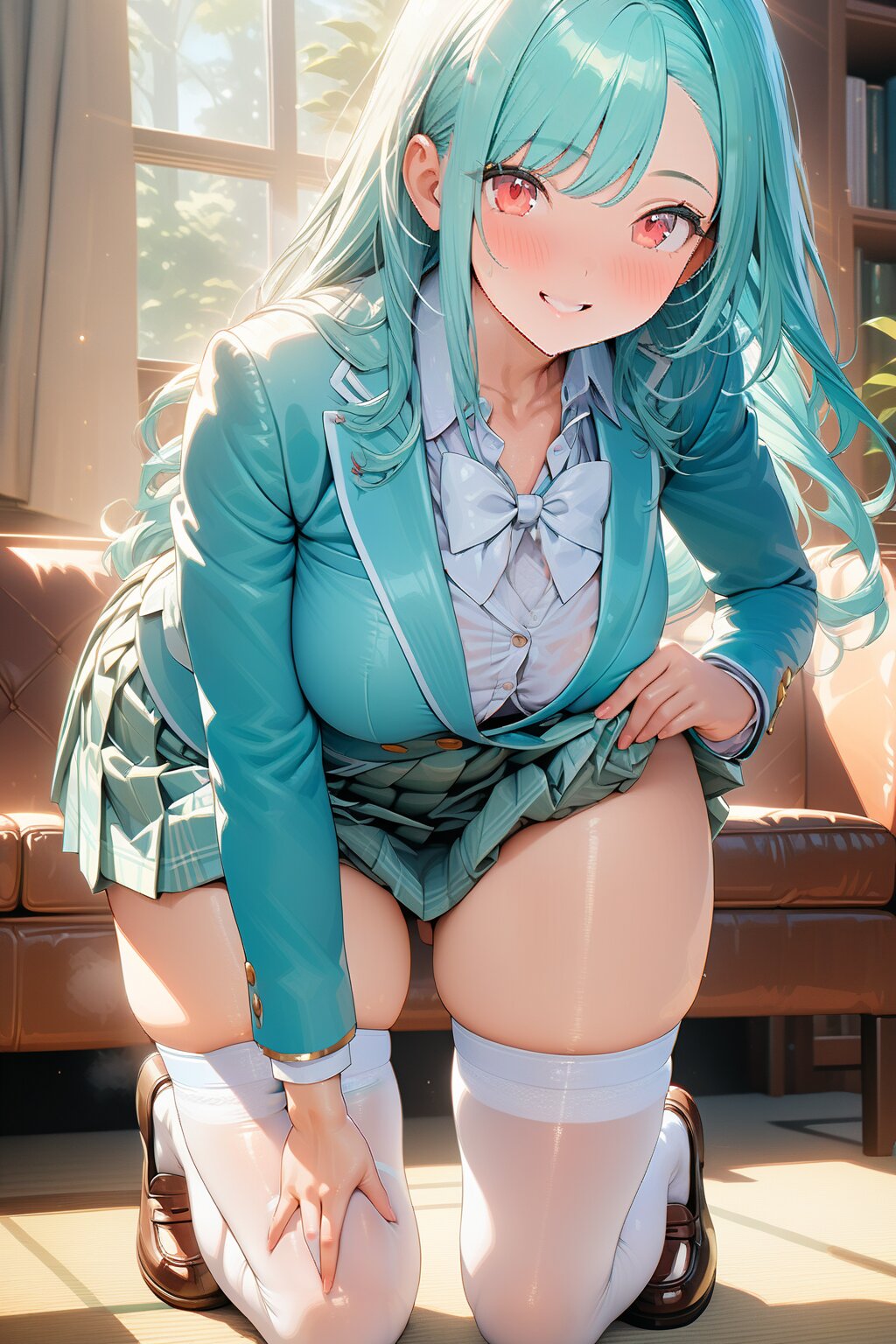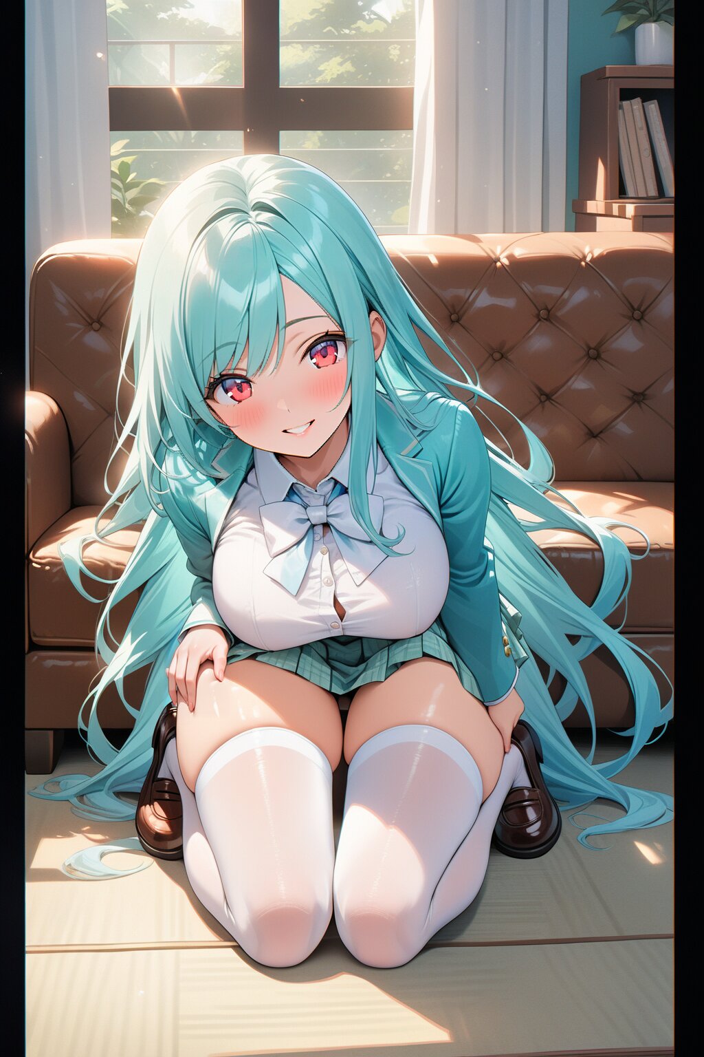 (full body:1.4),1girl, solo, (japanese girl:1.3), focus on character, looking at viewer, (kneeling:1.3), (on knees:1.2), (legs apart:1.3), (leaning forward:1.1), (hand on thigh:1.3), (indoors:1.1), (beige leather sofa:1.2), tufted sofa, sunlight, (window light:1.1), dramatic shadows, depth of field, ray tracing, cinematic lighting, detailed background, (light aqua long hair:1.5), (straight long hair:1.4), (asymmetrical bangs:1.2), (red eyes:1.2), (large breasts:1.3), (gleaming skin:1.4), (smile:1.3), blush, BREAK (school uniform:1.2), (light aqua blazer:1.3), (white trim:1.2), long sleeves, (white shirt:1.3), (collared shirt:1.2), (buttoned shirt:1.3), (white bowtie:1.2), ribbon, (light aqua skirt:1.2), (miniskirt:1.2), (white thighhighs:1.2), (sheer thighhighs:1.1), (shiny texture:1.1), brown loafers, shoes, ((8k, masterpiece, best quality, ultra-detailed)), game cg, masterpiece, (perfect face:1.1025), (perfect hands:1.1025), (perfect legs:1.1025), (perfect arms:1.1025), (perfect fingers:1.1025), <lora:xl_more_art-full_v1:0.6> <lora:add-detail-xl:1>,