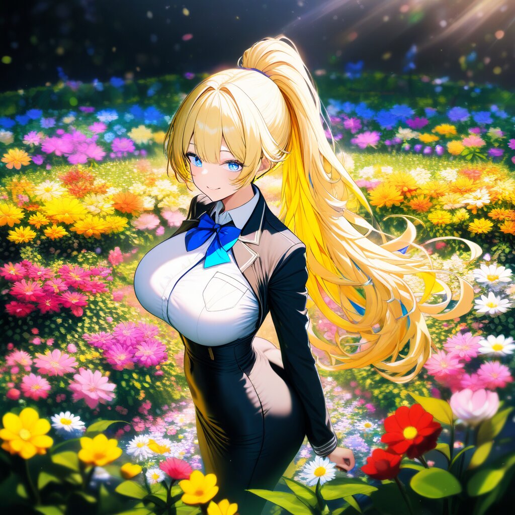 best quality,absurdres,8k,ultra detailed,very aesthetic,1girl,(rating: general:1.2),blonde hair,long hair,Ponytail Hair,blue eyes,smile,Big breasts, tight waist, big ass,school uniform,The chest is open,flower garden
