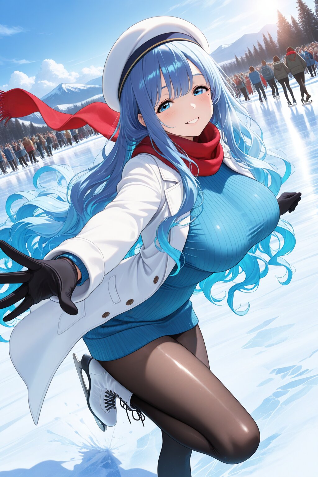 1 girl, outdoor,(ice skating rink),(frozen lake),(many people),(bloom,sunlight),(morning:1.3),blue sky, slender face,slender,(shiny skin),tall, huge breast, (navy and cerulean multicoloerd hair:1.3),(very long straight hair:1.3),(sidelocks),center flap bangs, (wavy hair:1.3),(inward curl hair:1.3),((hair on chest:1.3)), (glowing blue eyes:1.3),(narrow eyes:1.3),(tareme:1.3),(sleepy eyes),(mole under eye:1.3), seductive smile,chuckle, (blue long ribbed sweater),white long coat,black pantyhose,small white beret,red scarf,black glove, (ice skates,to ice skate),action pose,leaning forward:0.8,knee up,outstretched arm, cowboy shot,dynamic angle,looking at viewer,from side:0.8, ((best quality)),amazing quality,((very high resolution)),very aesthetic,((ultra detailed)),absurdres, full color,extremely detailed CG,super fine illustration, perfect anatomy,perfect hands,super detailed skin, (beautiful eyes,detailed eyes,perfect eyes,eye reflection),high-quality face,extremely detailed face, anime style,