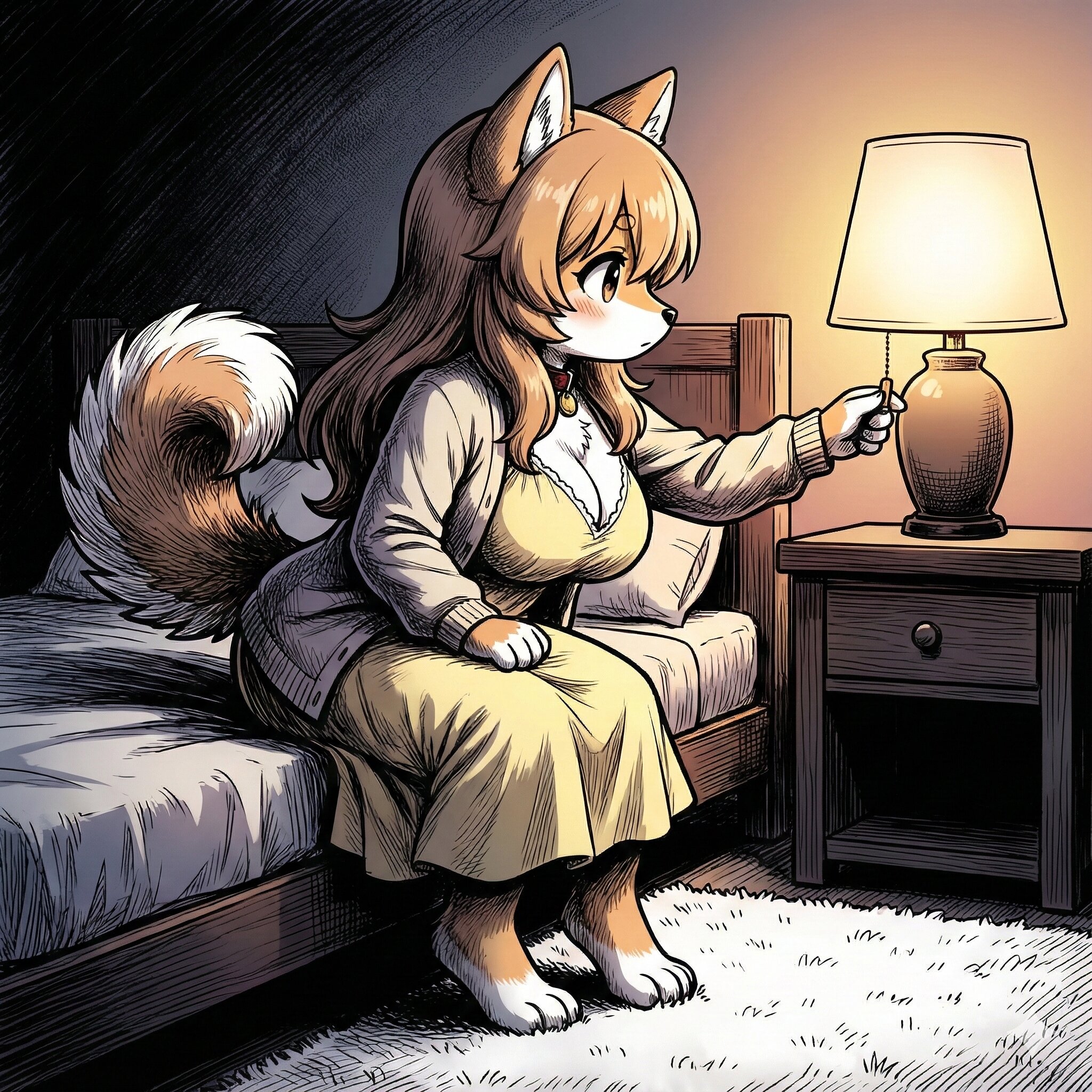 イラストのキャラクターをGペンでペン入れする。2D。カラー。強めの陰影とコントラスト。濃いトーンを貼っている。陰影をペン書き。線は細く薄くする。フラット。バストとヒップが豊満。腰は細い。背が低い。毛並みがモフモフ。キャラクターは柴犬の耳と丸まった尻尾を持つ。キャラクターの特徴をそのままに、ポーズを完全に変更。キャラクターをデフォルメにする。キャラクターは側面を向いている。夜、キャラクターはベッドサイドに座り、白いカーペットに足を着ける。ナイトテーブルの上のランプのスイッチを掴む。グラデーションを追加。