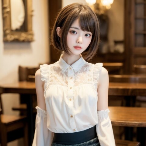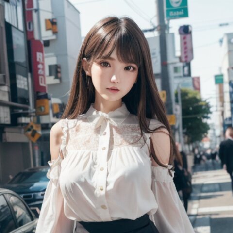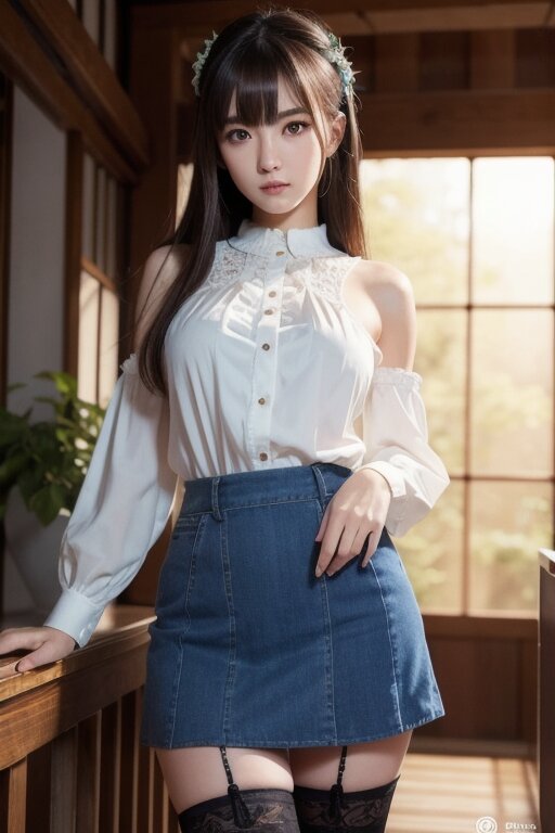 masterpiece, hyper detailed, 8K, hyper detailed illustration,extremely detailed CG, Japanese woman, 23yo, (cute:1.1), (pretty:1.1), hyper detailed face, hyper detailed eye, beautiful eye, extremely detailed, medium hair,(bangs:1.1), thin, tall, perfect anatomy, perfect proportions, extremely detailed body, blouse, short skirt, thighhighs, hyper detailed background,