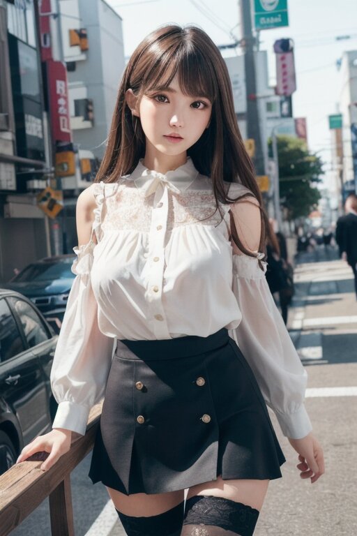 masterpiece, hyper detailed, 8K, hyper detailed illustration,extremely detailed CG, Japanese woman, 23yo, (cute:1.1), (pretty:1.1), hyper detailed face, hyper detailed eye, beautiful eye, extremely detailed, medium hair,(bangs:1.1), thin, tall, perfect anatomy, perfect proportions, extremely detailed body, blouse, short skirt, thighhighs, hyper detailed background,