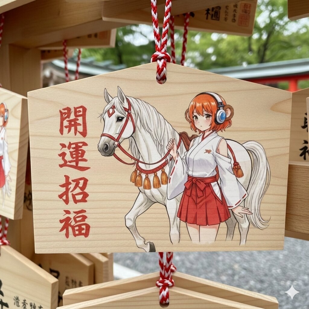 A brand-new Japanese wooden ema (votive plaque), clean and pristine, with a fresh, light wood texture, displayed at a Shinto shrine. The ema features an elegant illustration of Zena and a sacred horse, symbolizing the Year of the Horse. Zena is depicted in her iconic base design: short orange bob hair, stylish headphones, cute monkey ears, and a modern shrine maiden outfit with a white kimono top featuring shoulder slits and a short red mini skirt. Beside her stands a calm, noble horse, representing action, forward movement, and good fortune. On the ema, written vertically in bold red Japanese brush calligraphy, is the phrase: 「開運招福」 The vertical lettering is clear and powerful, standing out against the fresh wood, symbolizing blessings being drawn downward into reality. Soft, hand-painted Japanese illustration style, subtle watercolor texture, visible natural wood grain. Serene yet uplifting atmosphere, expressing new beginnings, positive change, and momentum. Japanese aesthetic, anime-style illustration, clean lineart, delicate brush texture, highly detailed, masterpiece quality.