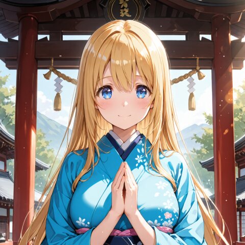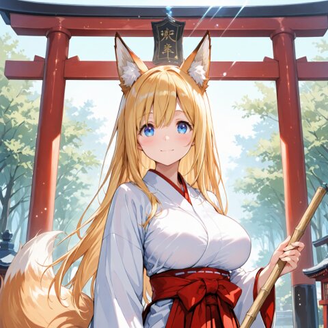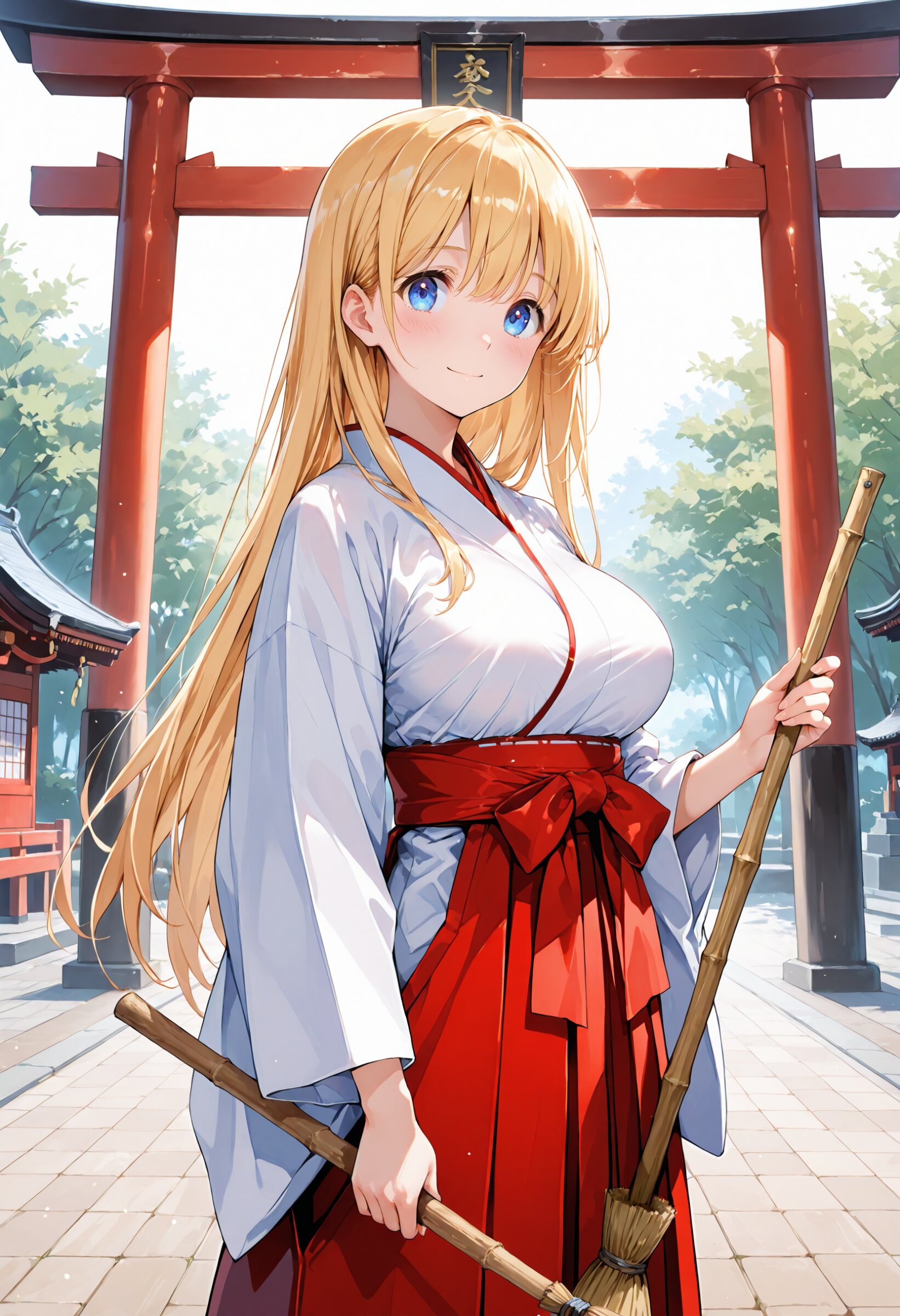 (masterpiece,high resolusion,illustration,ultra detailed 8k art,extremely detailed CG,official art,clothes reflecting light,detailed shiny skin,detailed background:1.3), ((highly detailed beautiful face and eyes)) BREAK 1girl, solo, standing, face_focus, 16-year-old, kawaii, cute_face, tareme, inocent_smile, no_makeup, beautiful_anime_girl, blonde_hair, long_hair, straight_hair, blue_eyes, beautiful_eyes, large_breasts, beautiful_breasts, miko_clothes BREAK holding_broom BREAK shrine, torii, outdoor,