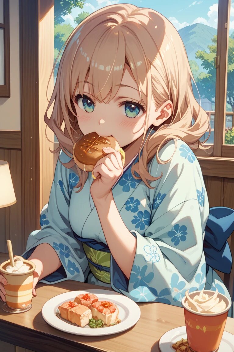 家の食卓で、着物姿の女性が食事をしている。食卓には焼きたてのお餅が皿にのせてある。焼きたてのお餅。